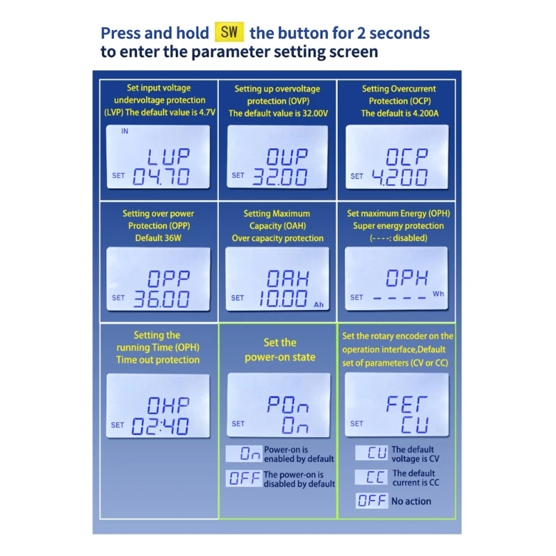 Nota: después de la protección del producto, la salida se apagará y la pantalla LCD mostrará el código de protección correspondiente (LVP / OVP / OCP / OPP / OAH / OPH / OHP).El chip de alimentación en sí también tiene varias protecciones.Si el chip en sí está protegido, se mostrará el OEP.