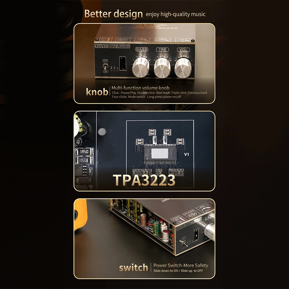 1. Chip TPA3223 de alto rendimiento: adopta un chip TPA3223 de grado audiófilo, admite calidad de sonido de componentes sin pérdidas, brindando una experiencia de audio más clara y detallada.