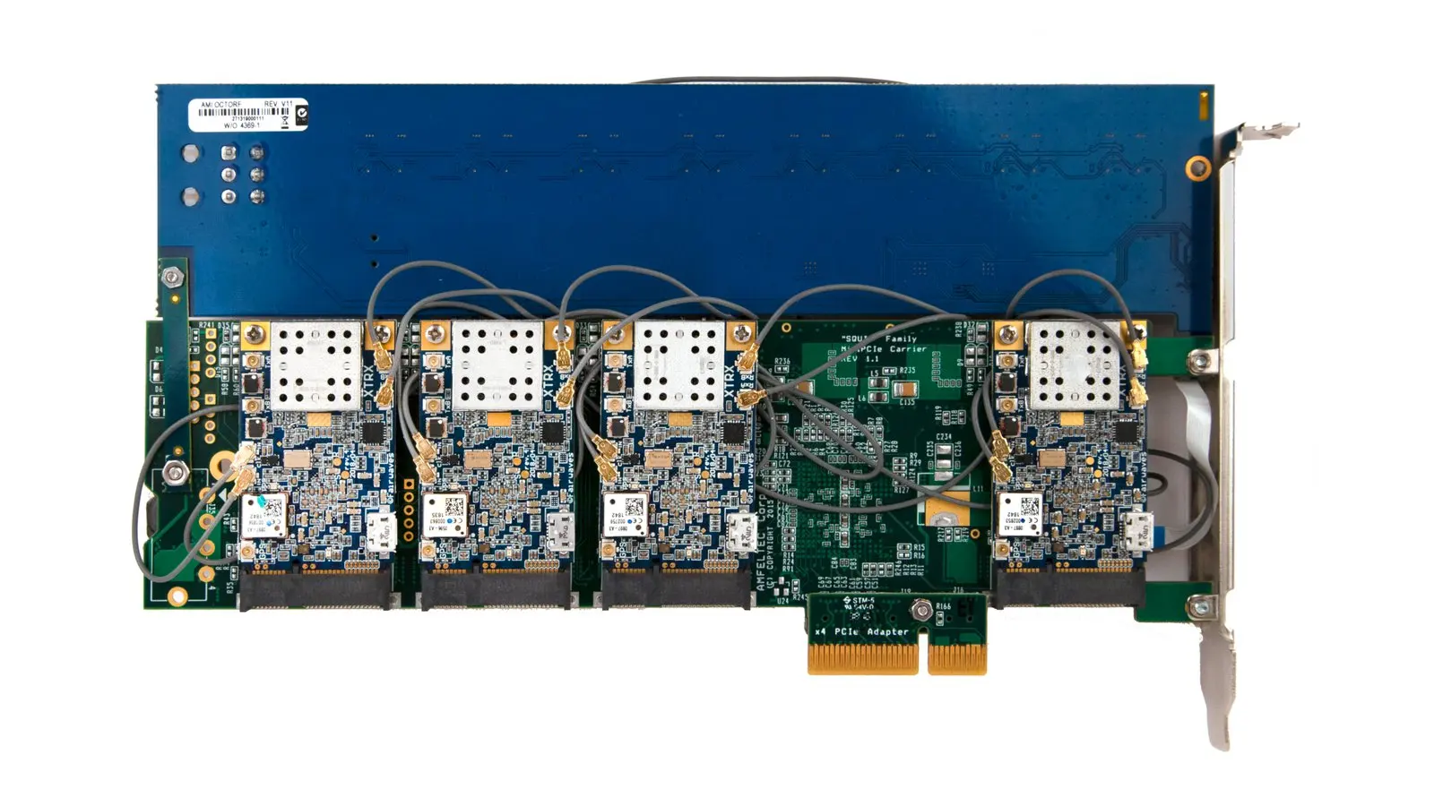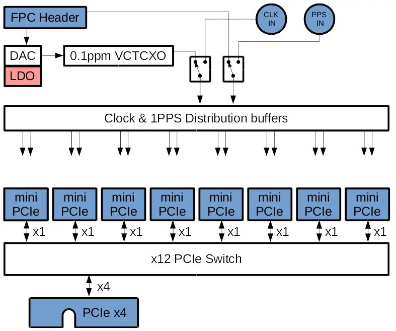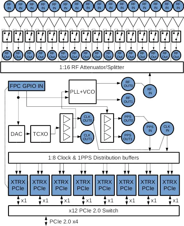 En el lado digital, cada unidad XTRX está conectada a un conmutador PCIe que multiplexa las carriles XTRX PCIe en un único conector PCIe 2.0 x4.Esto lo hace muy compacto y fácil de instalar en una PC estándar.No olvide proporcionar suficiente flujo de aire para enfriar, ya que las configuraciones como esta pueden calentarse bastante.