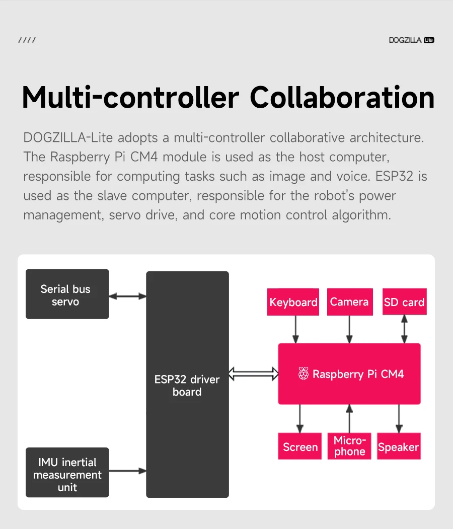 DOGZILLA-Lite es un perro robot biónico AI de escritorio 15-DOF.Está hecho de aleación de aluminio y viene con un brazo robótico y una pinza, que pueden realizar tareas de agarre de manera flexible.Módulo Raspberry Pi CM4 incorporado, admite detección de rostros, reconocimiento de objetos e interacción visual AI.Combinado con un modelo grande, no solo puede comprender las instrucciones, sino también realizar un diálogo gratuito, logrando una verdadera interacción inteligente multimodal.Tiene capacidades deportivas avanzadas como movimiento omnidireccional, control de postura de seis dimensiones y equilibrio dinámico.Con más de 40 funciones, desde el control remoto básico hasta aplicaciones inteligentes encarnadas, permite actualizar completamente el aprendizaje, el entretenimiento y la investigación tecnológica.Frente al perro robot, se integra una pantalla IPS de 2,0 pulgadas para mostrar 35 expresiones diferentes. Admite dos métodos de control: BT APP y WiFi APP.Ya sea programando aprendizaje, experimentos de IA o interacción creativa, DOGZILLA-Lite es su mejor socio.