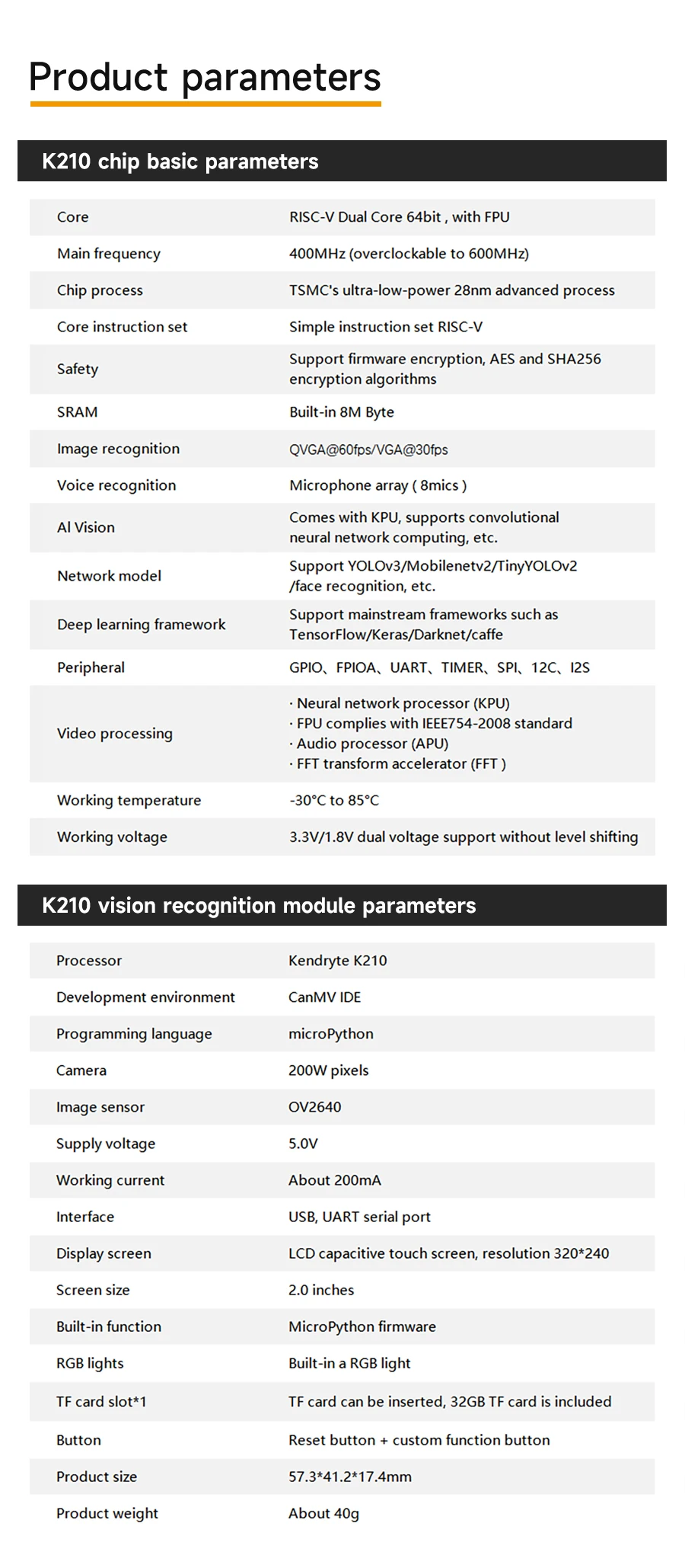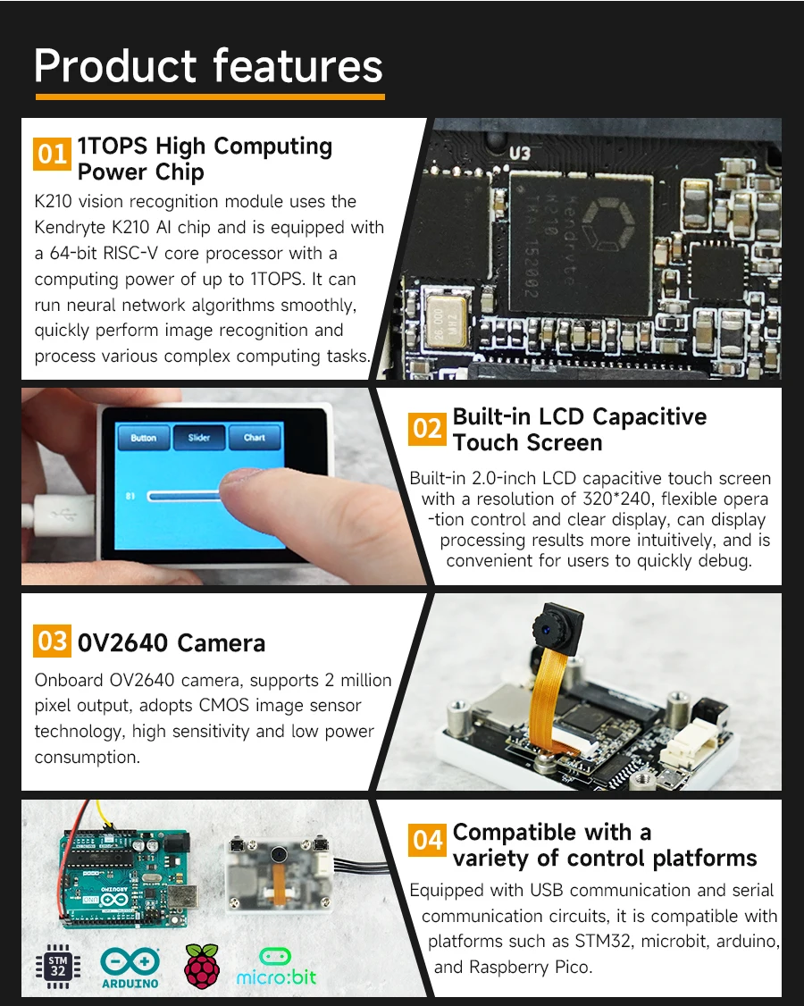 2) Adopte el chip Kendryte K210, con procesador de doble núcleo de 64 bits, la potencia informática puede alcanzar 1TOPS.