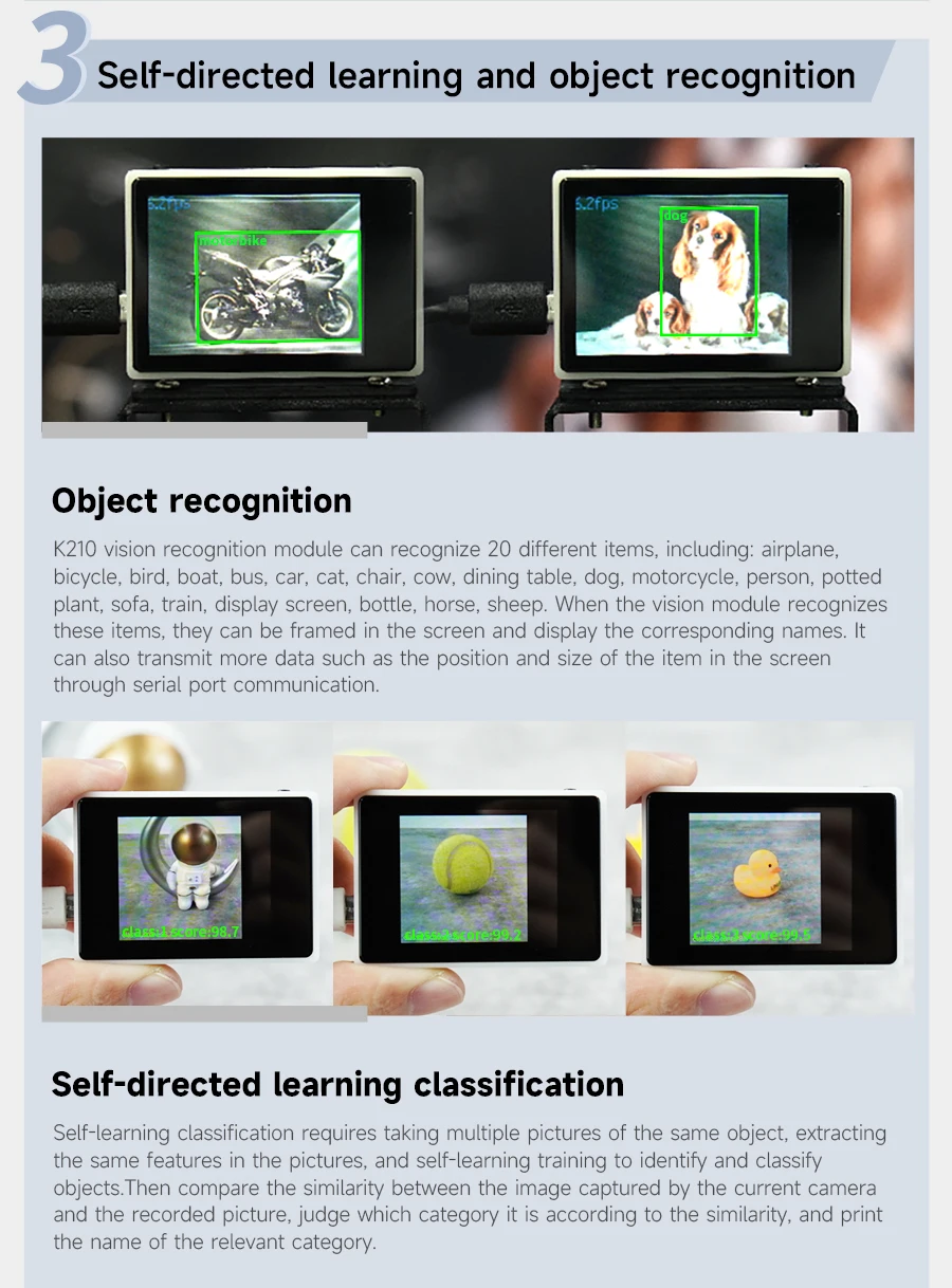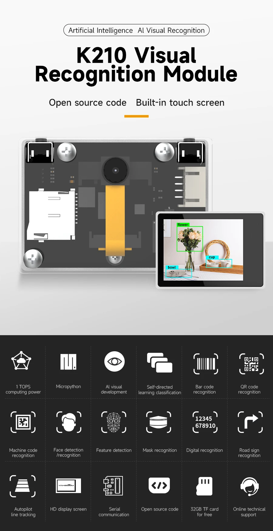 El módulo de reconocimiento visual Yahboom K210 es un módulo de procesamiento de imágenes basado en tecnología de inteligencia artificial.Posee un procesador de doble núcleo de 64 bits, que computa la potencia de hasta 1TOPS.Adopta un algoritmo de aprendizaje profundo, que puede identificar eficientemente varios objetos y características de la imagen.El módulo integra una interfaz serie, que se puede conectar e interactuar con varios controladores como STM32, Raspberry Pico, Arduino, Micro:bit y otros dispositivos y plataformas de hardware.El módulo K210 es de tamaño pequeño y bajo consumo de energía, lo que lo hace adecuado para diversos sistemas integrados y productos de hardware inteligentes.Los usuarios pueden crear fácilmente muchos proyectos creativos de IA con este módulo.