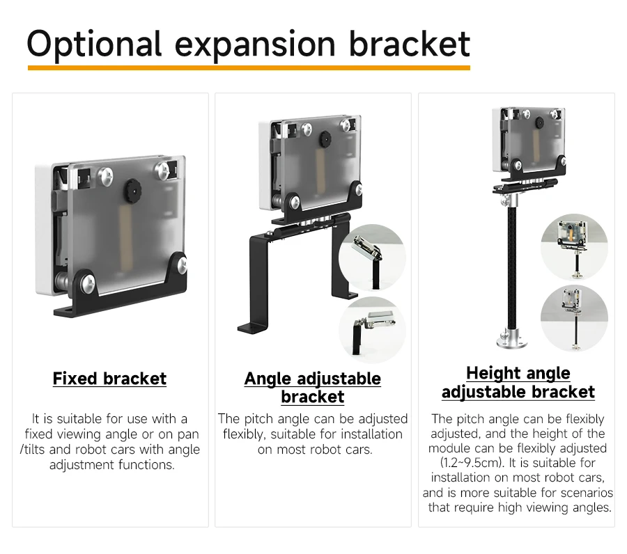 5) Tres soportes con diferentes alturas para elegir, los usuarios pueden fijar el módulo en diferentes robots o automóviles inteligentes.
