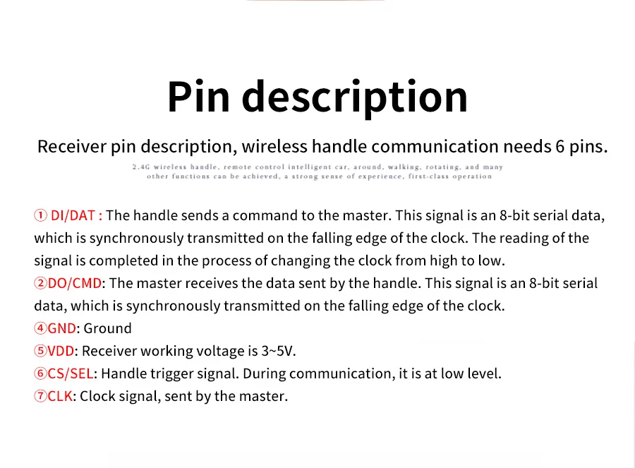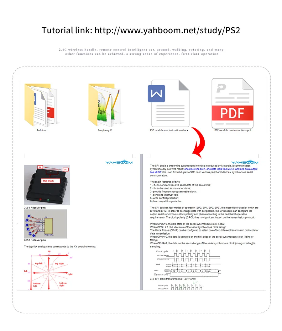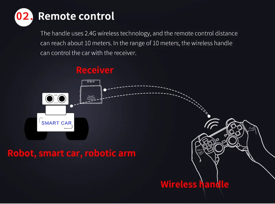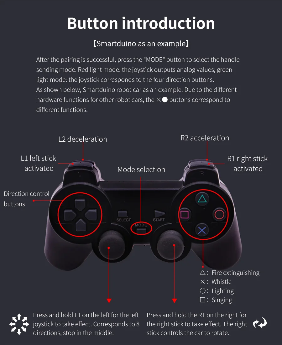 Este producto incluye un control remoto con mango de PS2 y un receptor.El control remoto con mango de PS2 adopta la tecnología inalámbrica 2,4G.Después de un suministro de energía normal, el mango y el receptor se pueden emparejar automáticamente.Damos la línea DuPont para conectarse al automóvil inteligente, placa de desarrollo y otros equipos.El control remoto del mango integra múltiples botones y módulos basculantes, y el funcionamiento es muy bueno.La comunicación SPI entre el receptor y el controlador principal es altamente sensible y receptiva.El uso de este mango permite al usuario experimentar una sensación de juego.