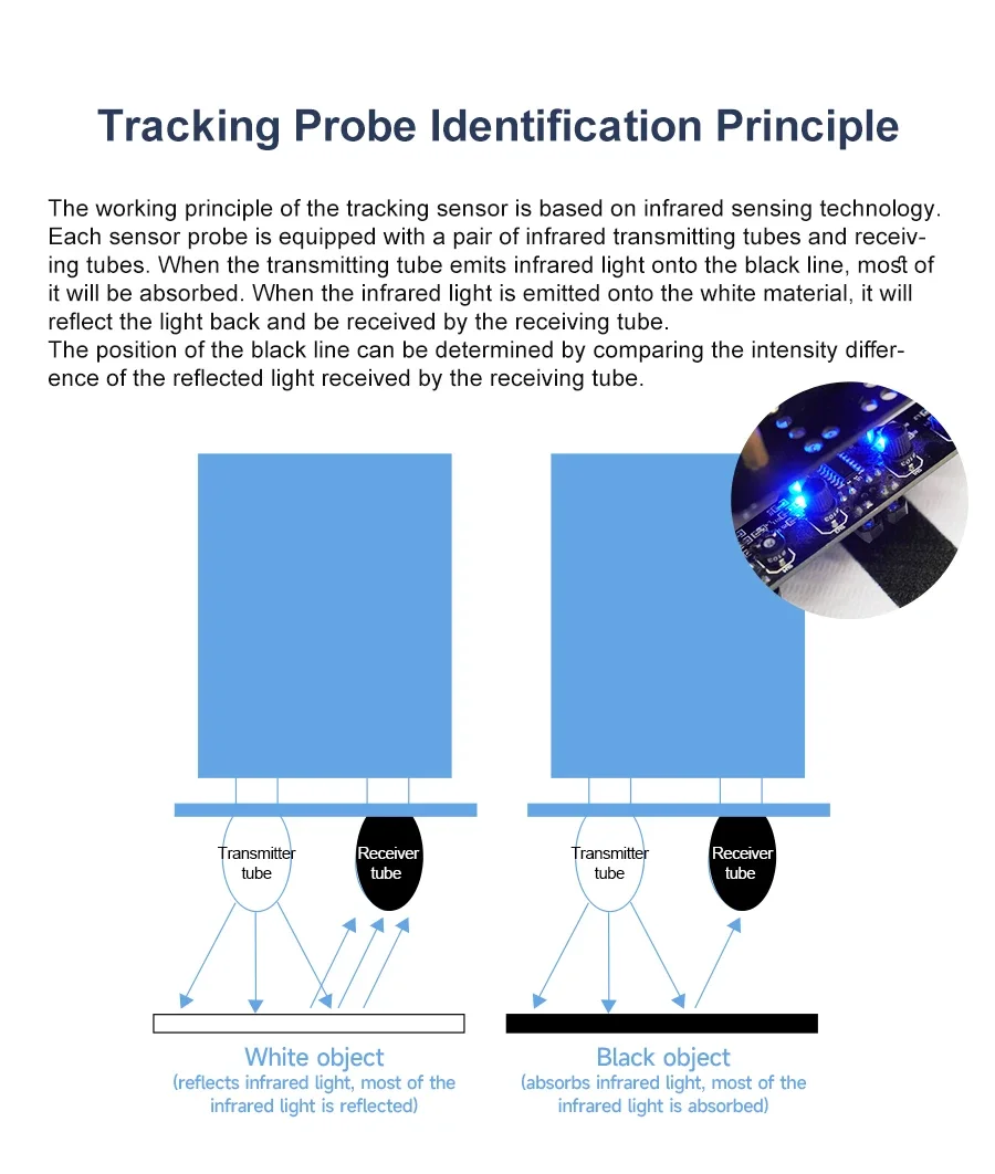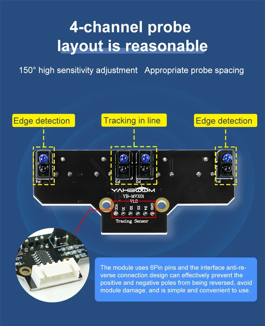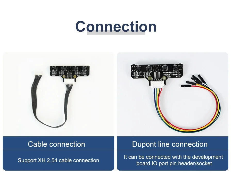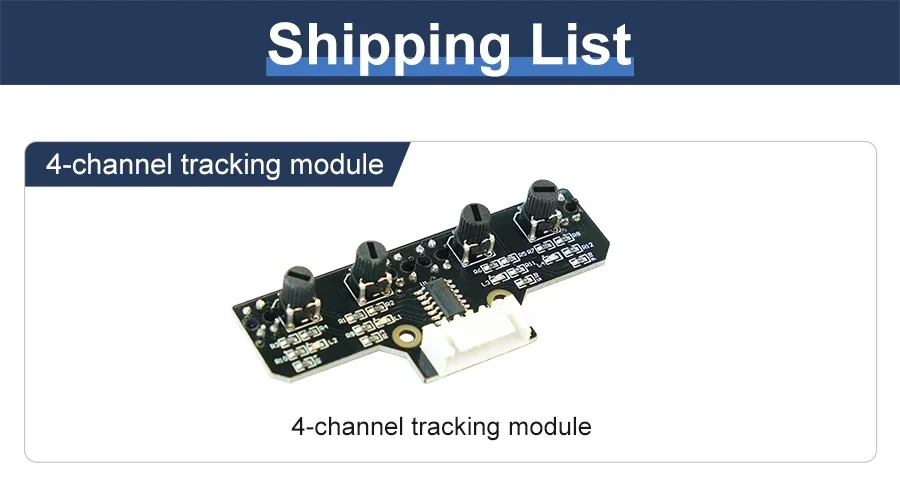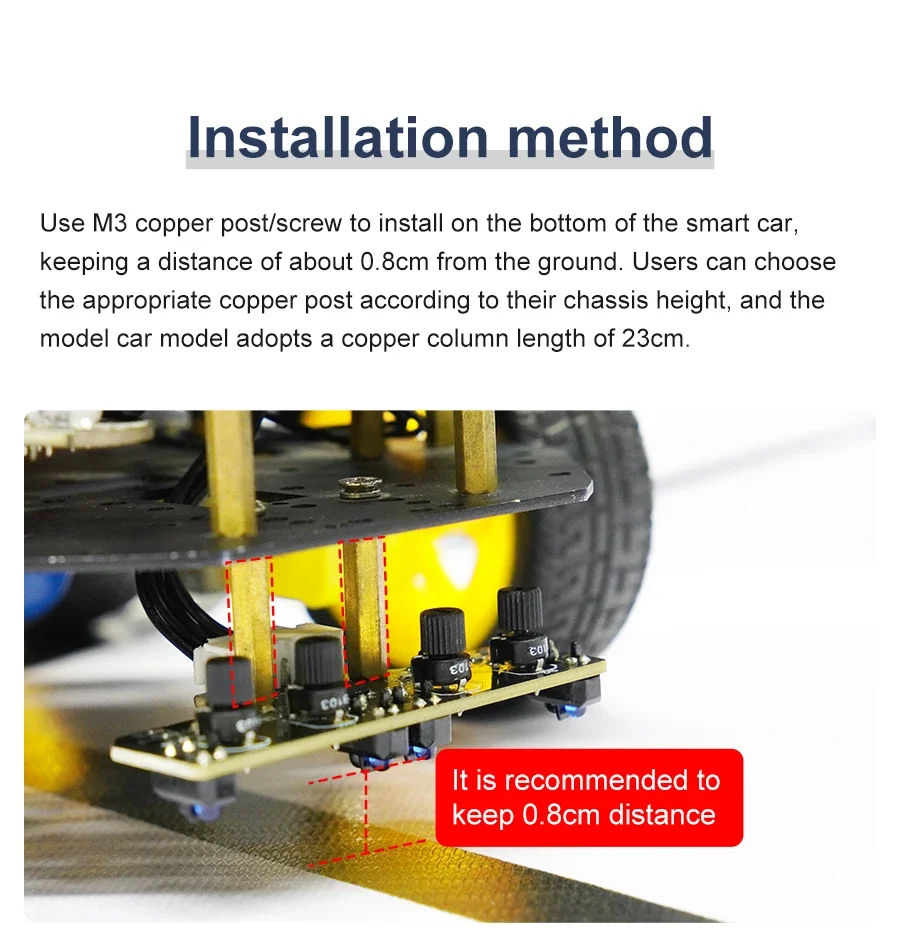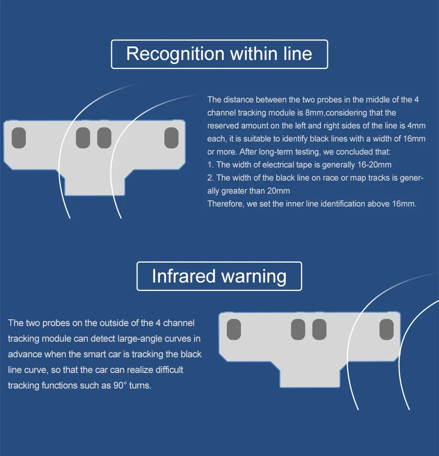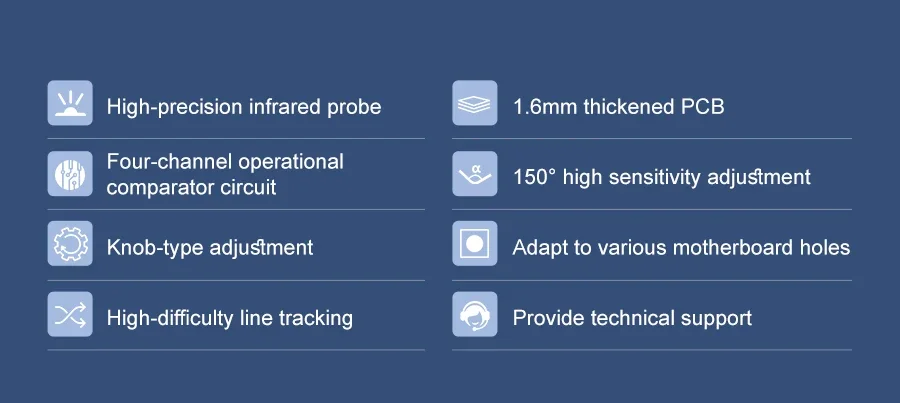 Este módulo de seguimiento adopta cuatro sondas de seguimiento y un diseño de espaciado optimizado.Las dos sondas internas pueden identificar con precisión la línea negra.Las dos sondas exteriores pueden ayudar a la sonda interna a identificar la línea negra y proporcionar una alerta temprana.El coche puede reconocer los 90°Ruta curva y otras pistas difíciles.Las resistencias ajustables tipo perilla y los circuitos de amplificador operacional profesionales nos permiten ajustar la sensibilidad del sensor.Puede utilizar un cable o un cable DuPont para conectarlo a un automóvil inteligente o a una placa de expansión para diversos experimentos.También hemos reservado el orificio para instalar las columnas y tornillos de cobre, puedes ampliarlo tú mismo.