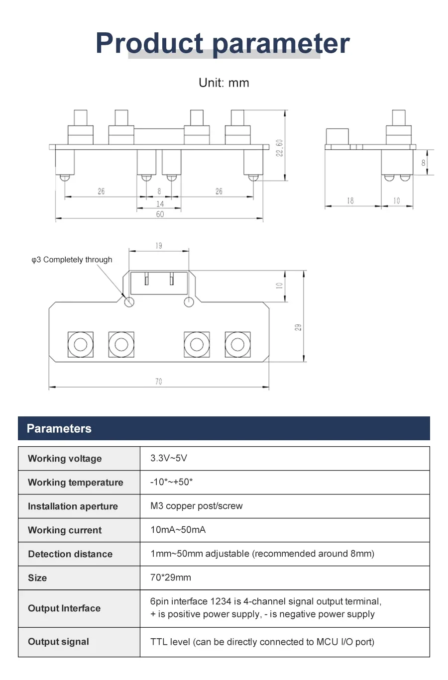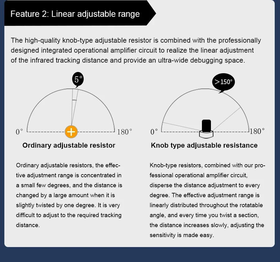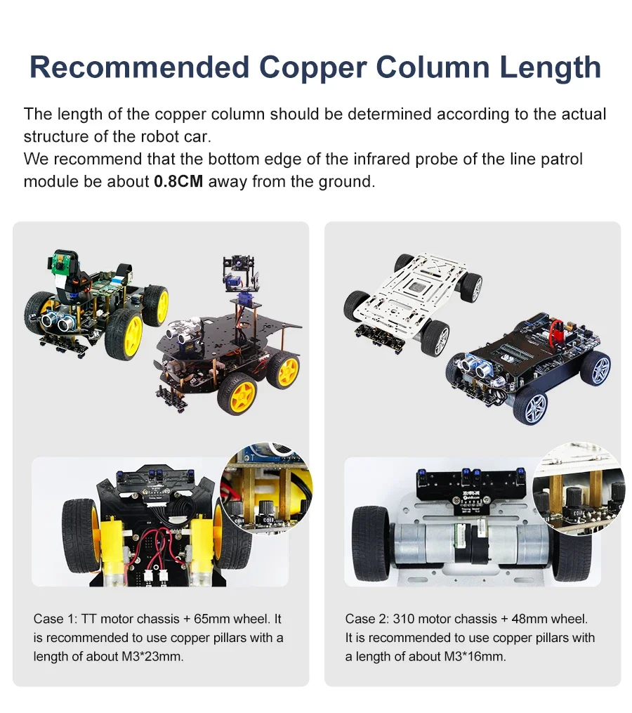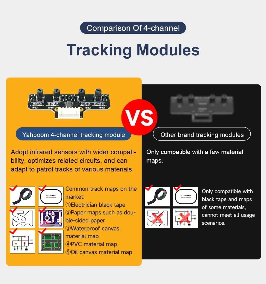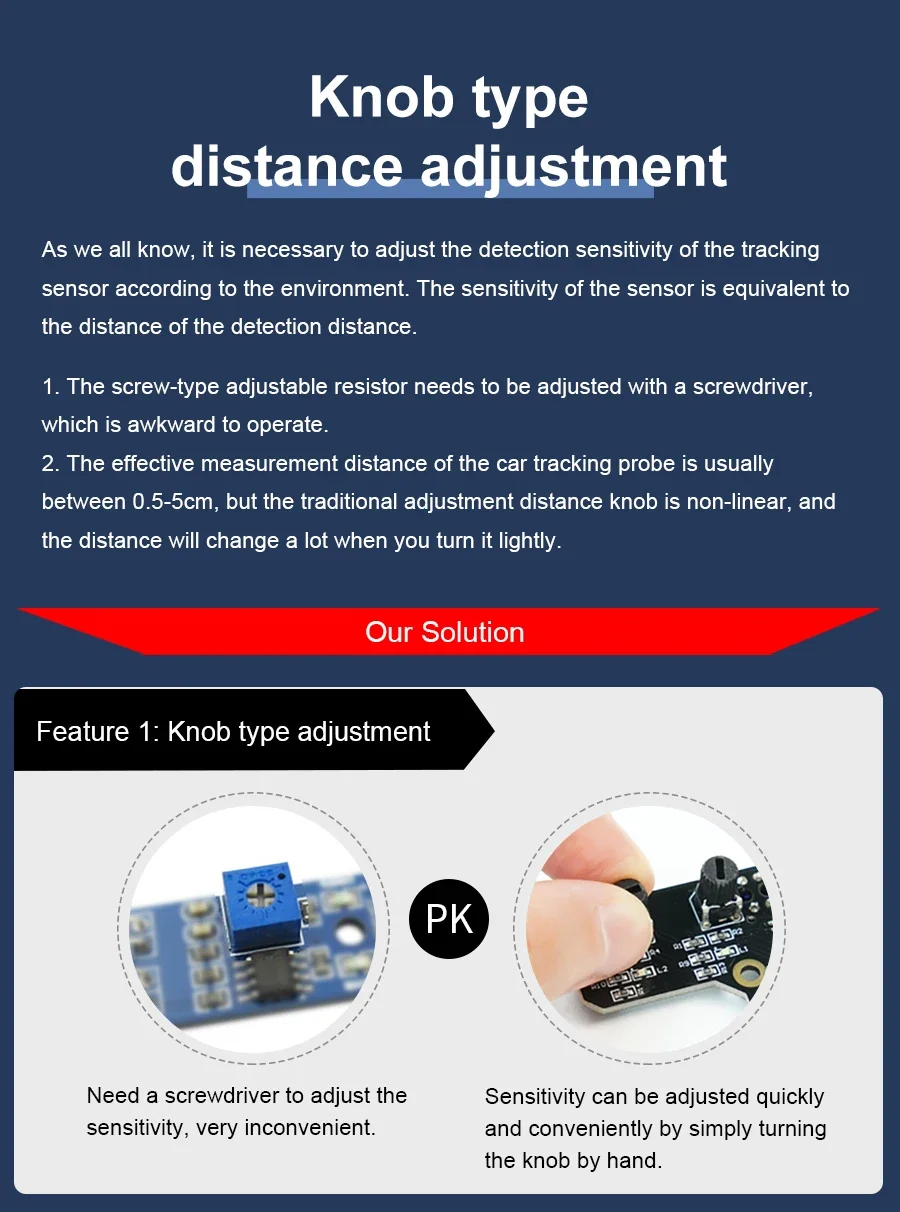 Este módulo de seguimiento adopta cuatro sondas de seguimiento y un diseño de espaciado optimizado.Las dos sondas internas pueden identificar con precisión la línea negra.Las dos sondas exteriores pueden ayudar a la sonda interna a identificar la línea negra y proporcionar una alerta temprana.El coche puede reconocer los 90°Ruta curva y otras pistas difíciles.Las resistencias ajustables tipo perilla y los circuitos de amplificador operacional profesionales nos permiten ajustar la sensibilidad del sensor.Puede utilizar un cable o un cable DuPont para conectarlo a un automóvil inteligente o a una placa de expansión para diversos experimentos.También hemos reservado el orificio para instalar las columnas y tornillos de cobre, puedes ampliarlo tú mismo.