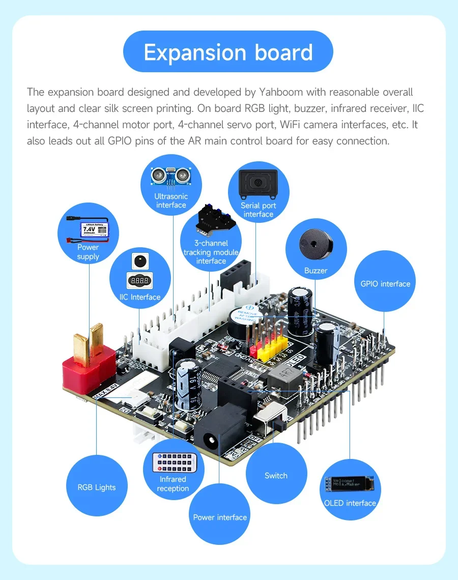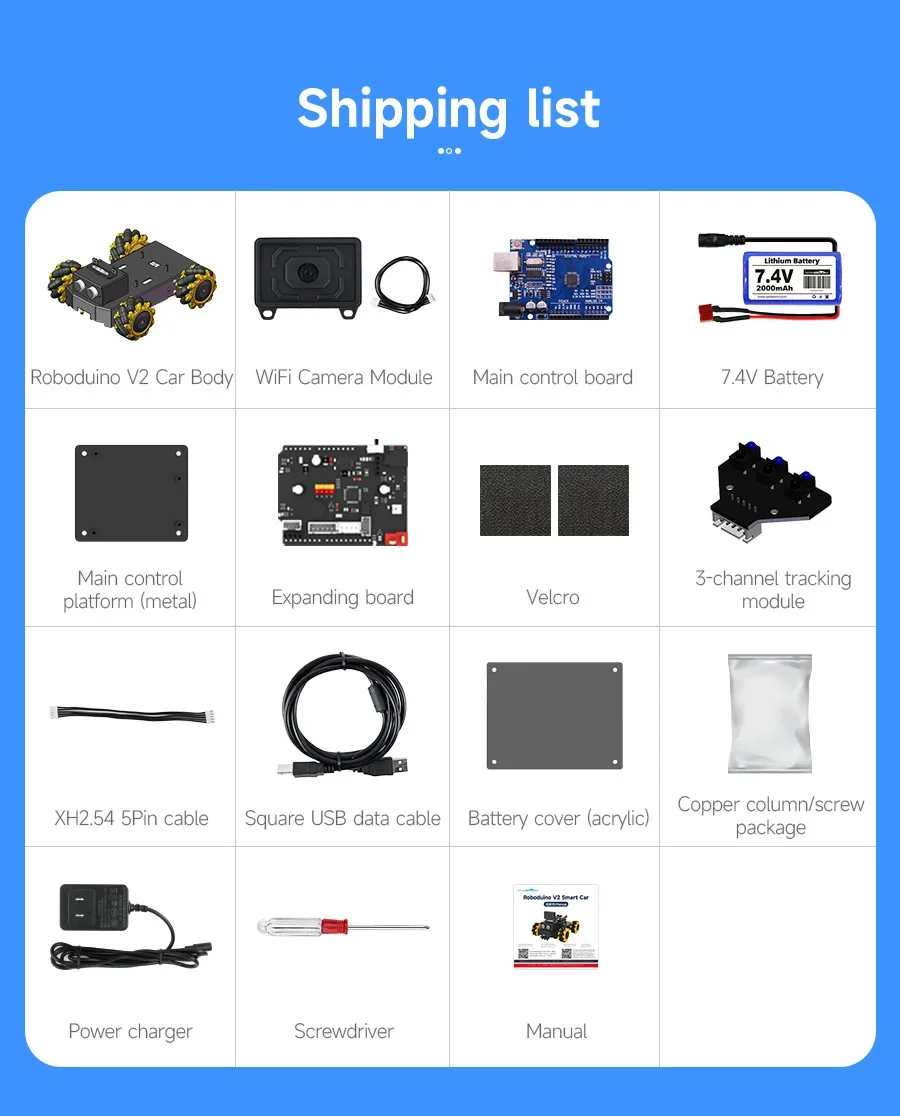 El proceso de ensamblaje de Roboduino V2 es simple y fácil de entender, y todo el cableado utiliza una interfaz de conexión anti-reversa, lo que reduce efectivamente la posibilidad de error.Yahboom proporciona vídeos de montaje y pasos claros, así como todos los programas y códigos necesarios.