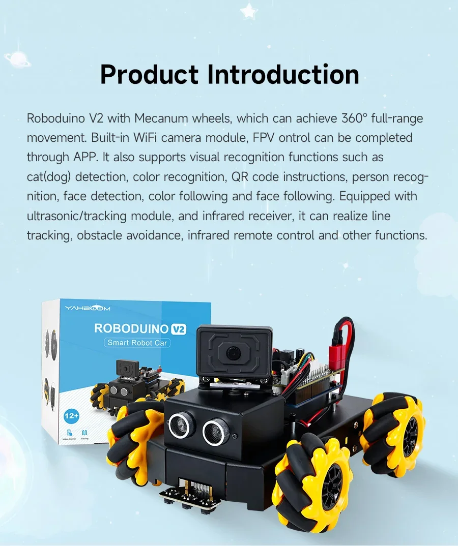 Roboduino V2 es un robot auto multifuncional basado en Yahboom UNO R3.El cuerpo totalmente metálico con ruedas Mecanum de 60 mm, combinado con un motor de 4 canales de accionamiento independiente, que puede alcanzar 360° movimiento omnidireccional.También está equipado con un módulo de cámara WiFi ESP32, que puede realizar la transmisión de video en tiempo real a través de la aplicación del teléfono móvil.El kit también incluye una placa de expansión multifunción, un módulo ultrasónico, un módulo de seguimiento de 3 canales, un control remoto por infrarrojos, etc.Los usuarios pueden realizar efectos especiales de luz RGB, seguimiento de líneas, evitación de obstáculos, control remoto por infrarrojos y otras funciones a través de la programación del idioma C.Fácil de montar, adecuado para que personas de diferentes edades aprendan a programar.