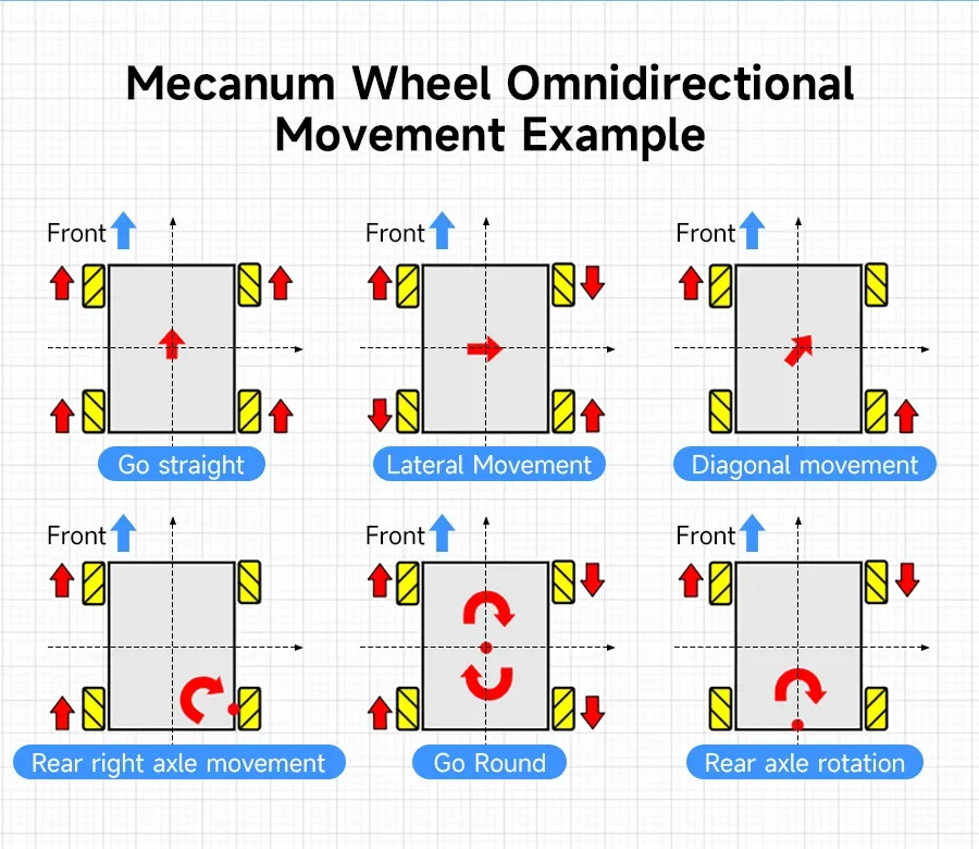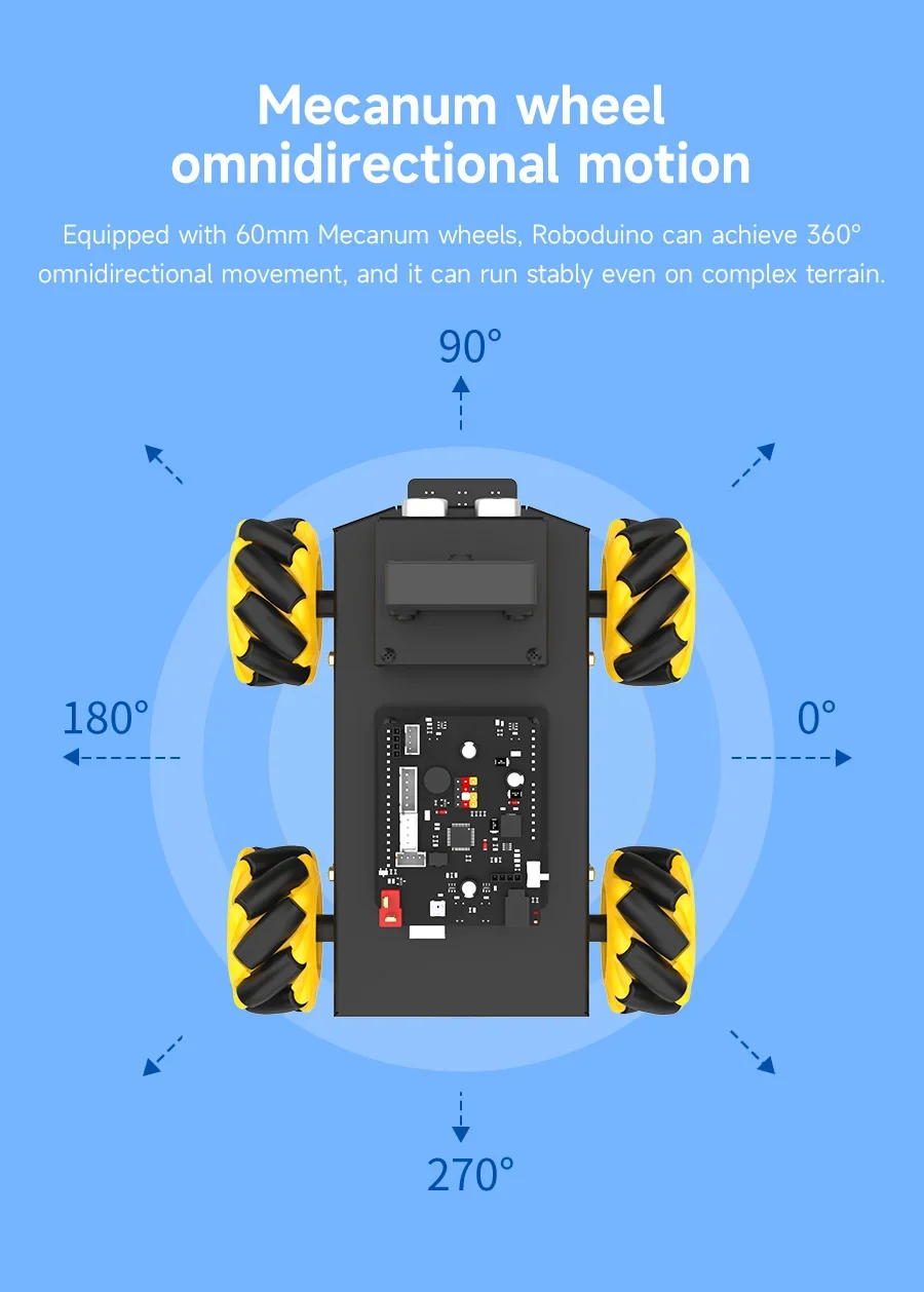 Roboduino V2 está equipado con ruedas Mecanum de alta calidad de 60 mm, combinadas con tecnología de accionamiento independiente de motor de 4 canales, que le permite alcanzar fácilmente 360° movimiento omnidireccional.Ya sea recto, girando o girando en su lugar, Roboduino V2 puede responder de manera flexible.