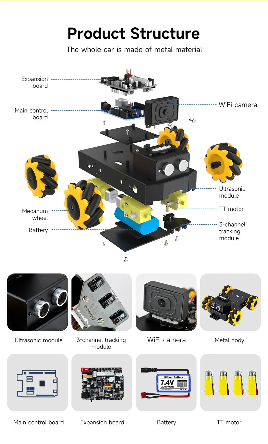 Todo el vehículo está fabricado de metal.Además de la placa de expansión multifunción, también está equipada con ricos dispositivos de expansión como ultrasonido, módulo de seguimiento de 3 canales, control remoto por infrarrojos, etc.Estos dispositivos brindan soporte funcional para Roboduino V2.