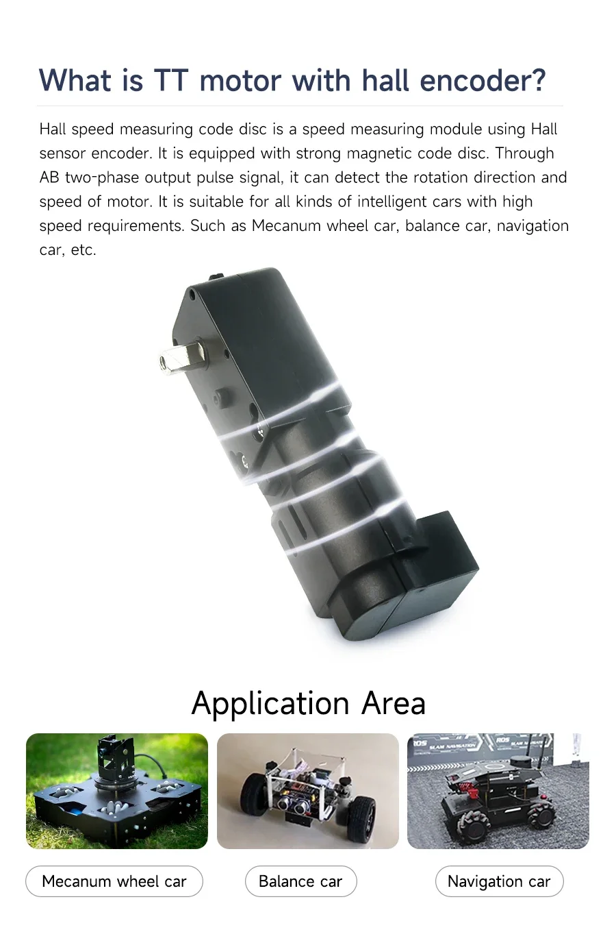 Estos motores TT de alta calidad están equipados con sensores Hall de alta precisión para una medición precisa de la velocidad.Y tiene una mejor capacidad antiinterferencias, velocidad estable y admite control PID.También se puede utilizar con un soporte de motor para instalarlo en el coche inteligente.Proporcionaremos códigos de unidad detallados y materiales tutoriales como referencia del usuario.