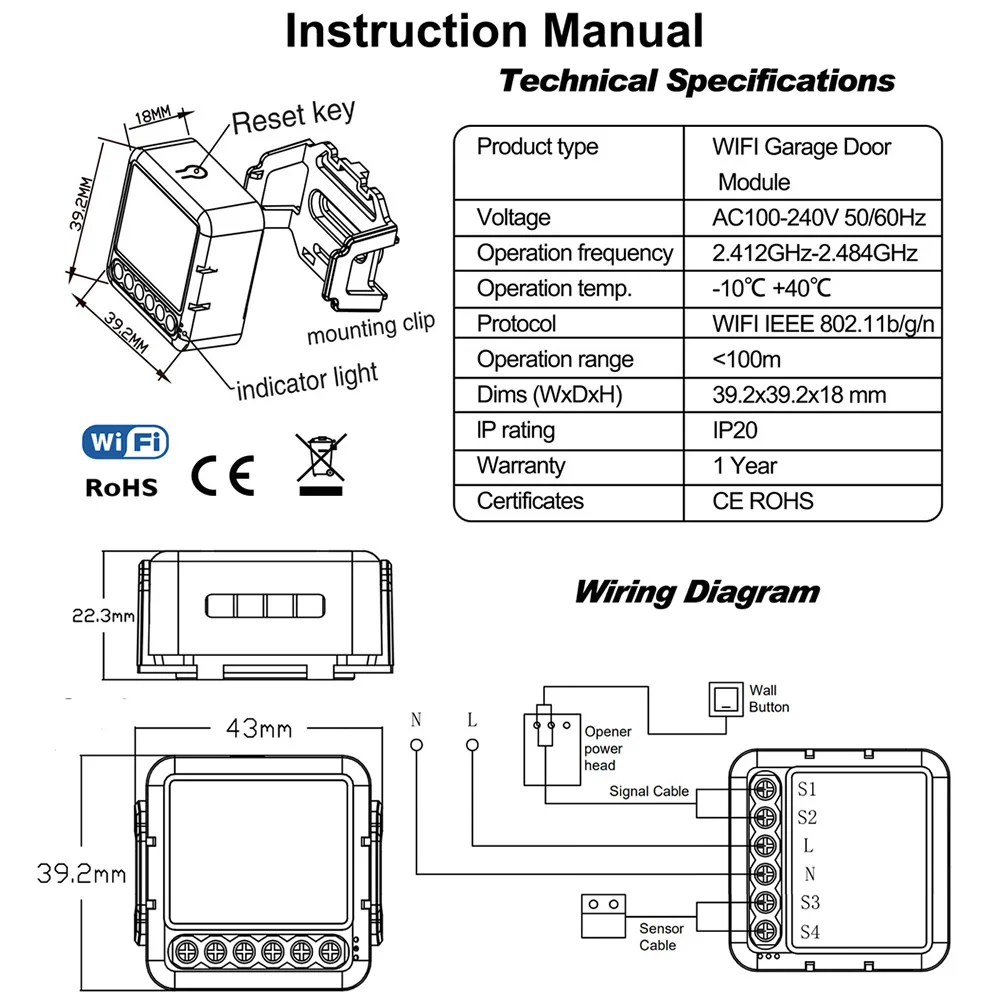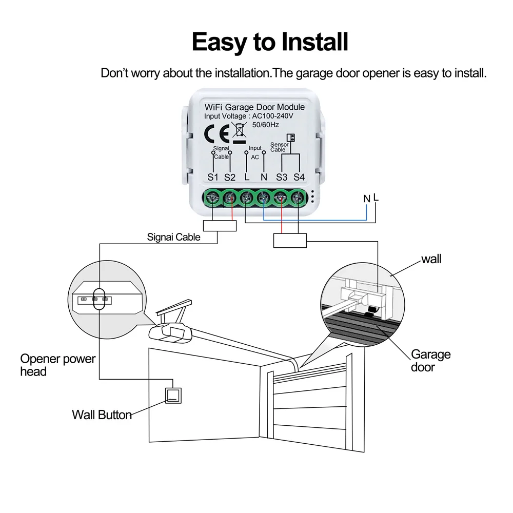 1. Asegúrese de que haya un interruptor externo en la puerta de su garaje, de lo contrario no se podrá instalar el módulo de interruptor. Si la puerta del garaje se puede controlar mediante un interruptor y un controlador externos, también puede instalar el módulo.
