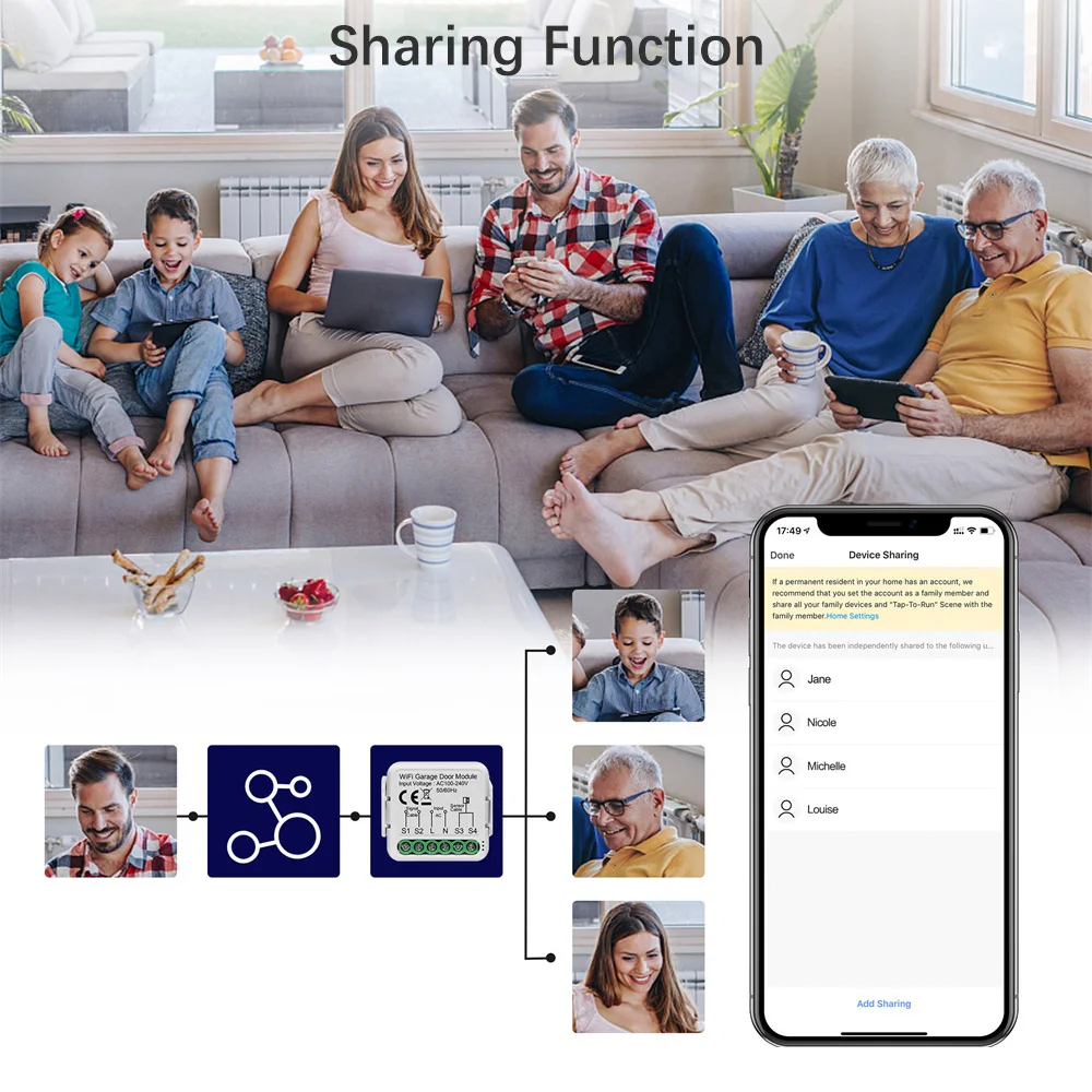 Comparta los permisos de operación del módulo de puerta de garaje inteligente con su familia, disfrutando juntos de una vida inteligente y conveniente.
