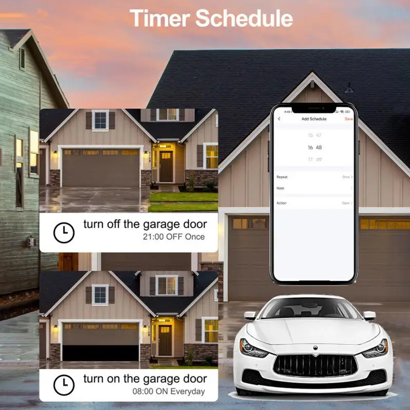 Se puede configurar un temporizador adecuado para activar la apertura/cierre de la puerta del garaje de acuerdo con sus necesidades para salir o ir a casa, creando una vida más inteligente para usted mismo con el abridor de puerta de garaje inteligente.