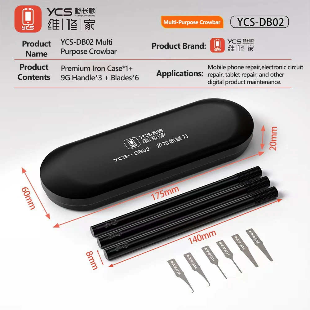 Mejore el flujo de trabajo de reparación de su móvil con el juego de palanca YCS-DB02 de YCS Maintenance Home: una solución 9 en 1 diseñada para abrir fundas de teléfonos, quitar adhesivos y manipular componentes delicados.Diseñado tanto para profesionales como para entusiastas del bricolaje, este juego combina durabilidad, precisión y portabilidad.