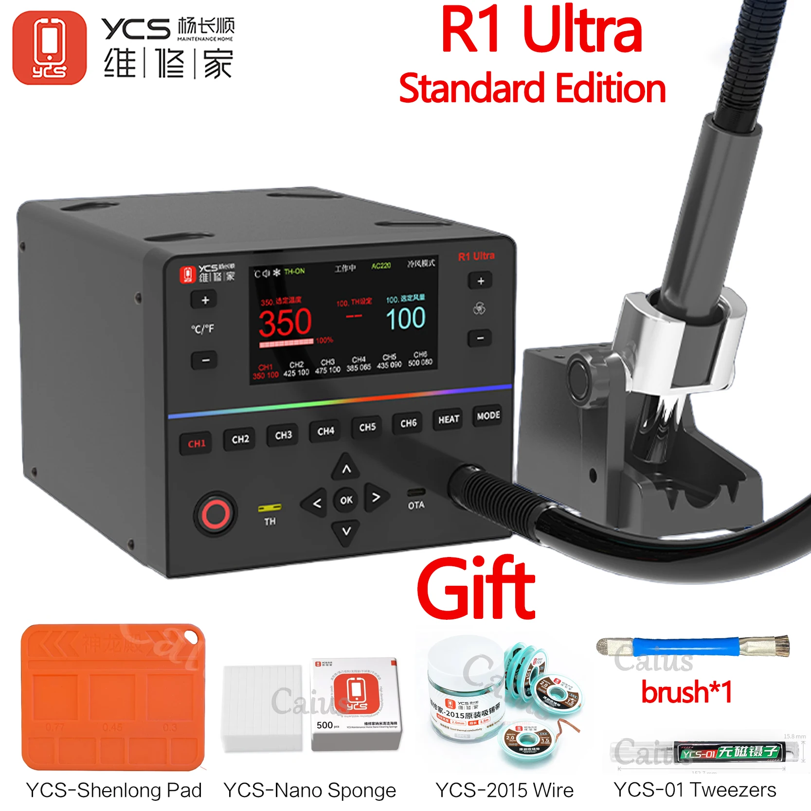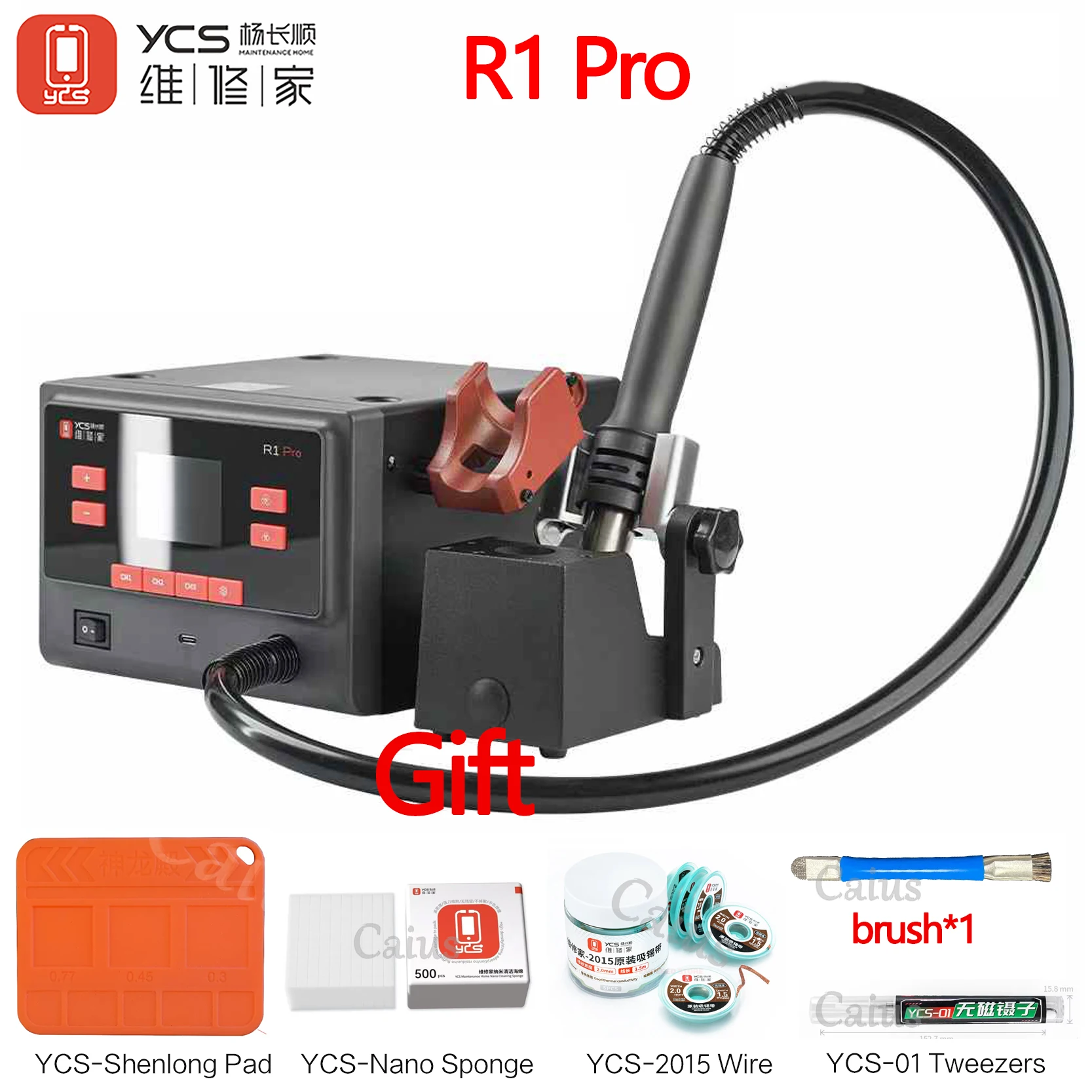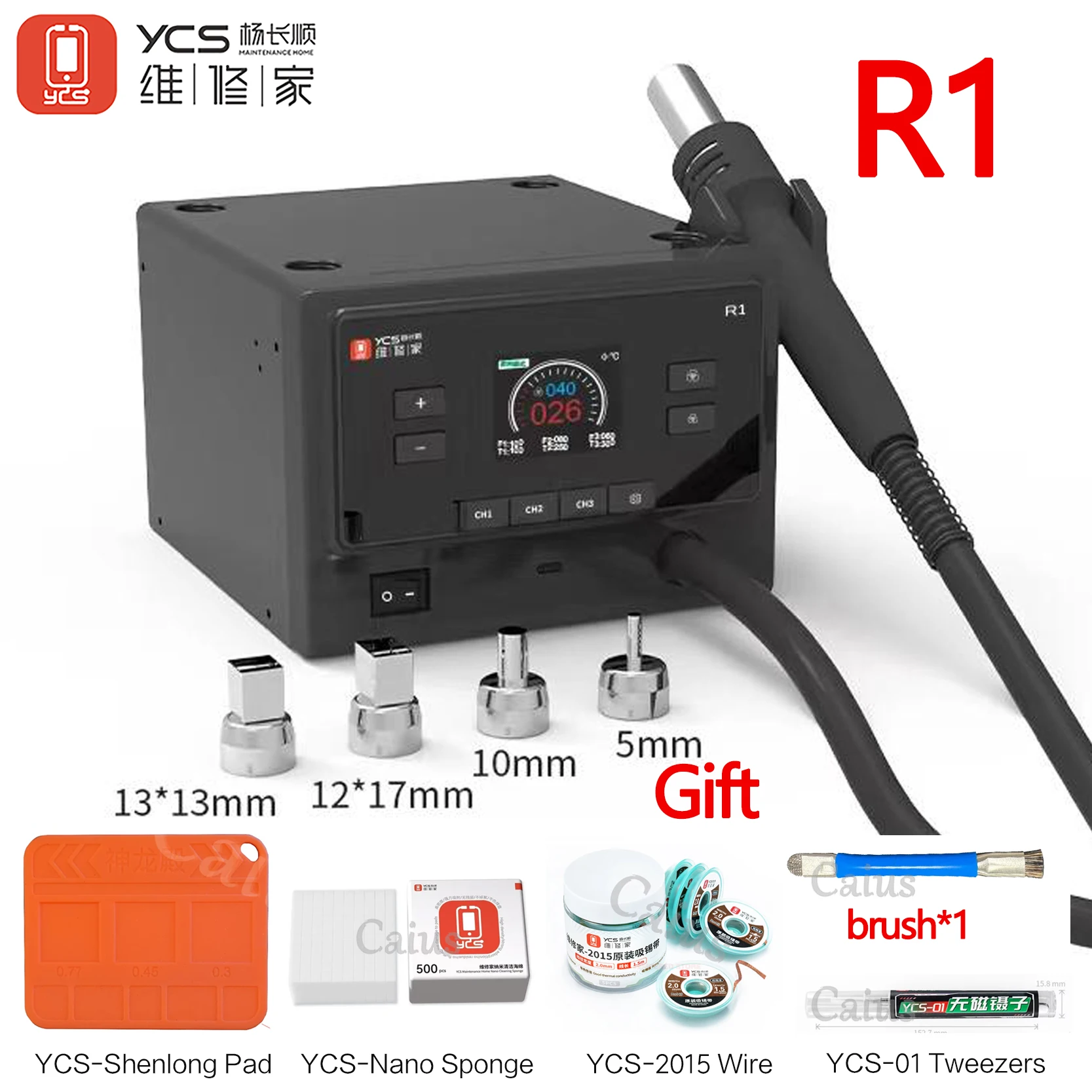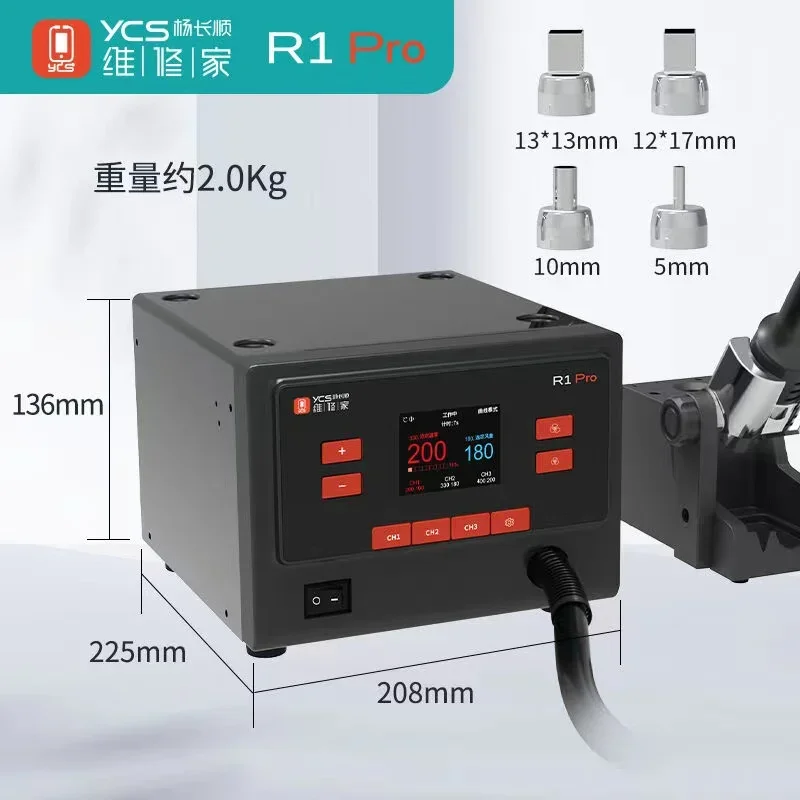 Una estación de aire caliente súper potente que se calienta muy rápido y se enfría igual de rápido. Puede calentar de 100 a 550°C y es muy silenciosa. Se enciende automáticamente cuando se retira del soporte frontal.