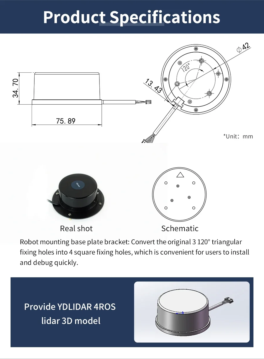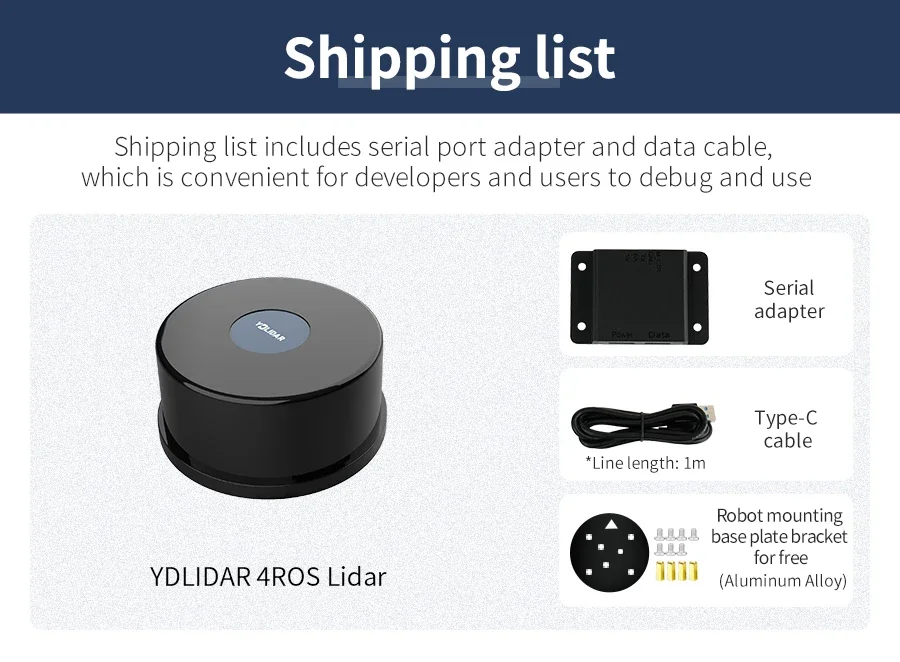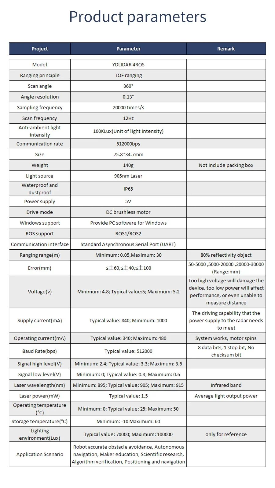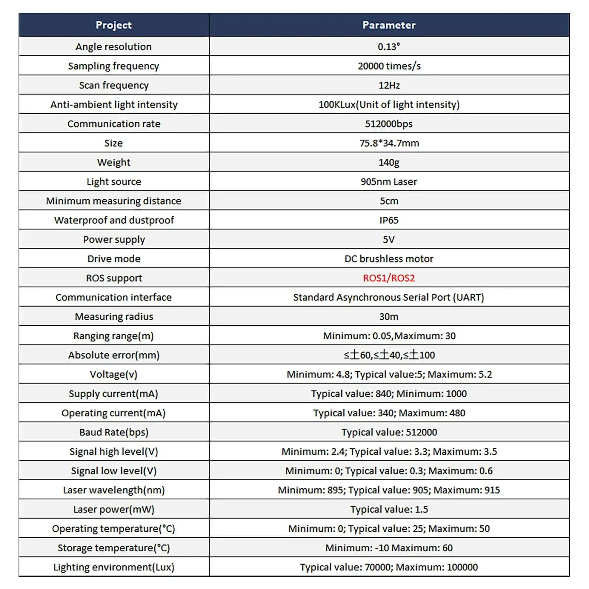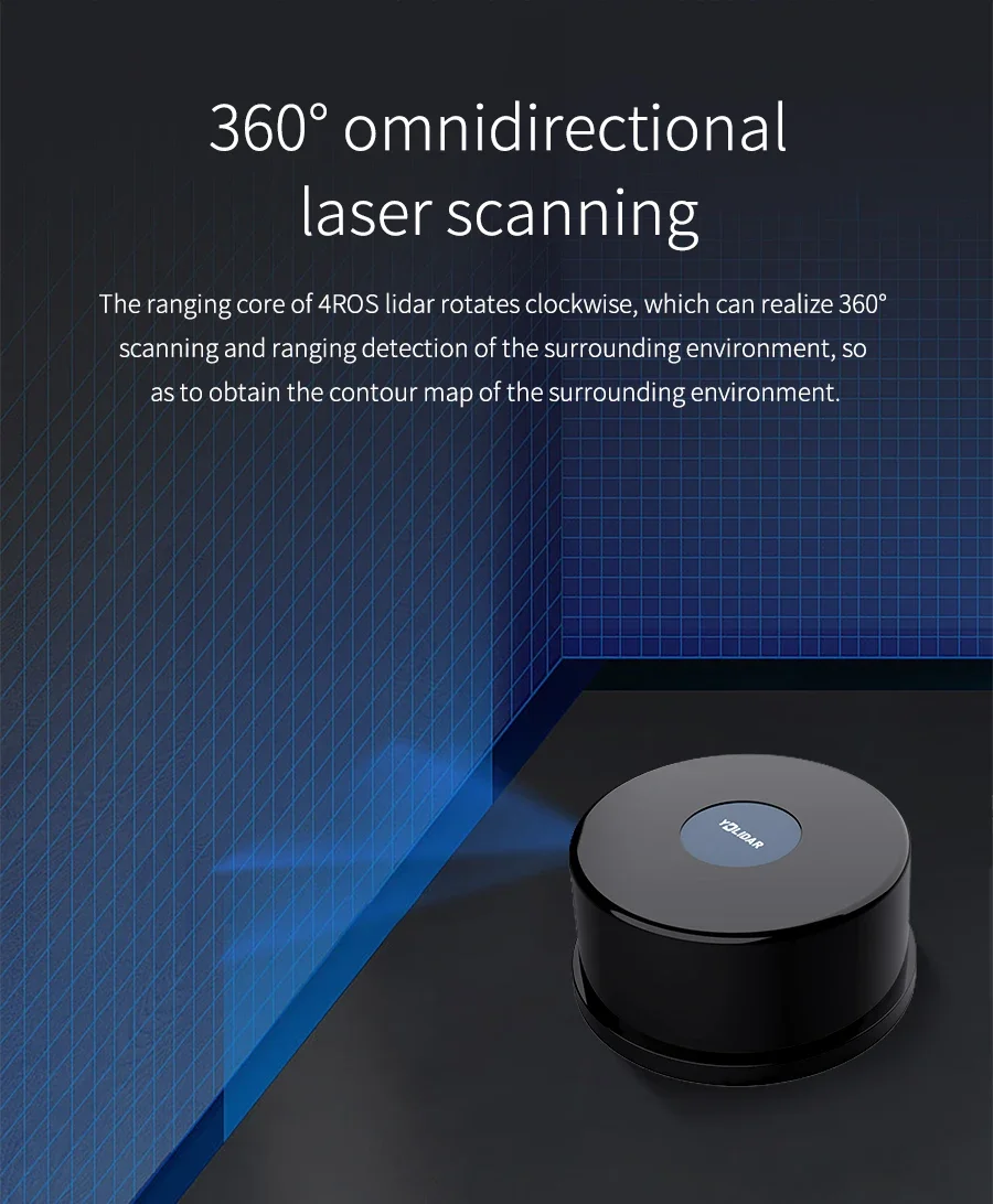 Este lidar YDLIDRA 4ROS tiene solo 7,58 cm * 3,47 cm de tamaño.Viene con un controlador de motor con función de regulación de velocidad en el interior y una cubierta protectora cerrada con clasificación IP65 en el exterior, que es resistente al agua y al polvo.Utilizando tecnología TOF, la frecuencia de muestreo es de 2000 veces/S y el radio de escaneo puede alcanzar unos 30 m.Debido a que puede resistir el entorno de luz intensa de 100KLux, los usuarios pueden usarlo para lograr un alcance y un mapeo de alta precisión sin importar en interiores o exteriores.Proporcionaremos códigos fuente abiertos para el sistema ROS1/ROS y el escaneo de mapeo lidar de robots.