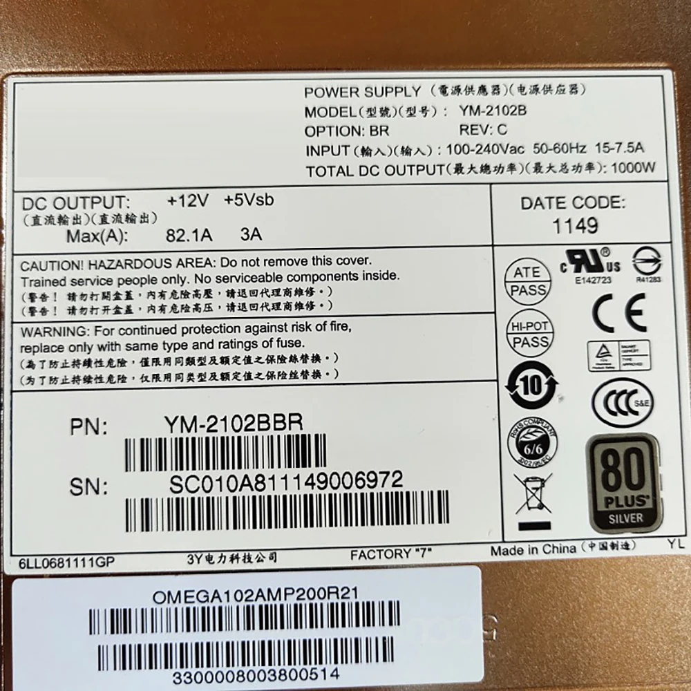YM-2102B para fuente de alimentación de servidor 3Y A840R-G -10 1000W MAX