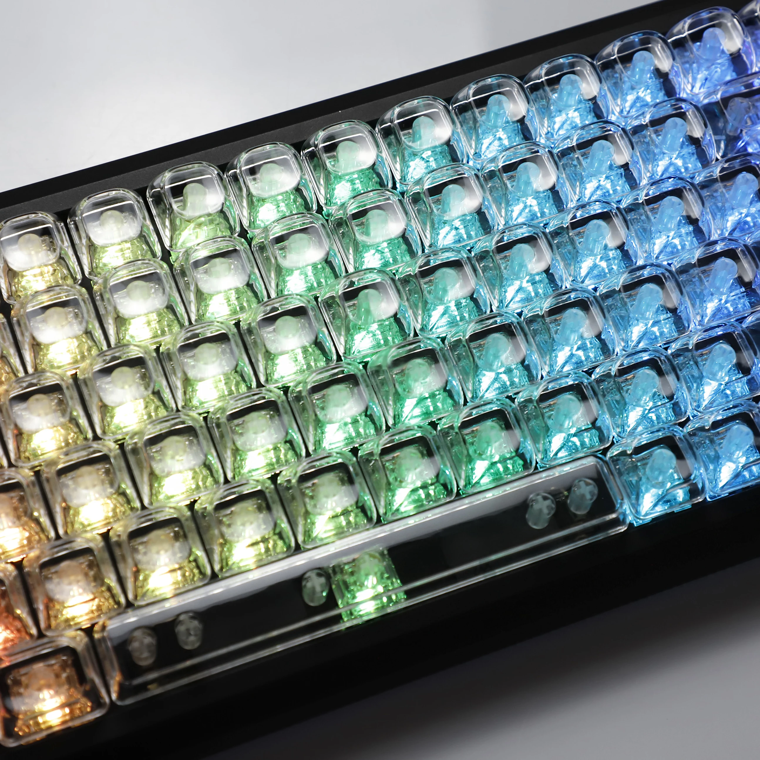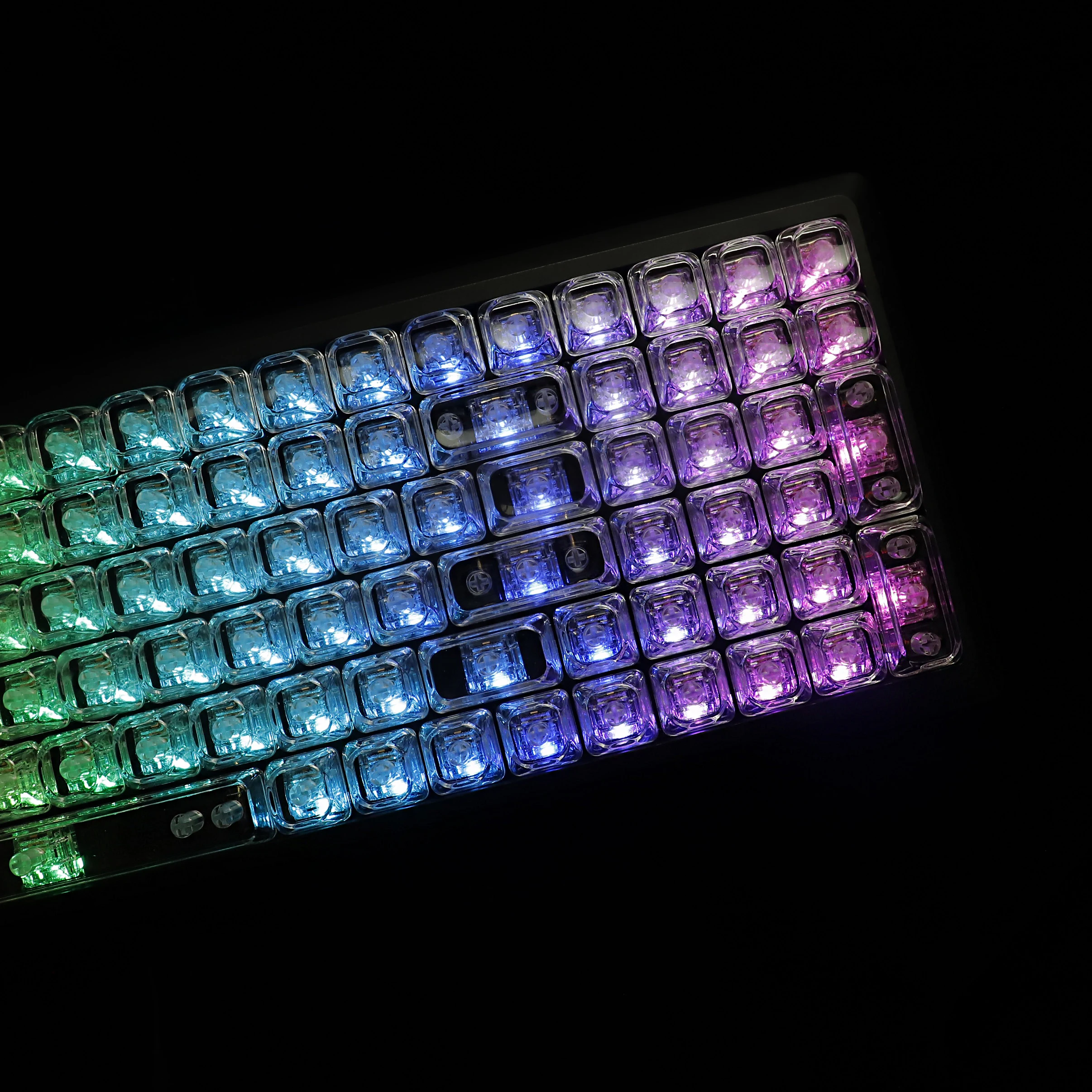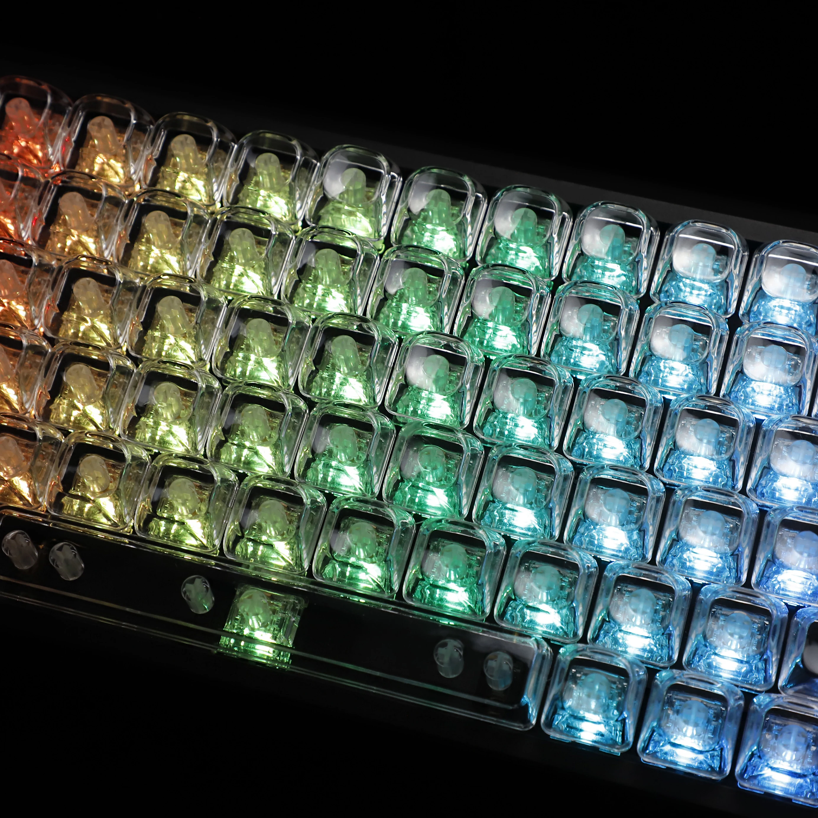 Las teclas transparentes están hechas de material de PC.Las características transparentes del material de PC no solo añaden una belleza única a las teclas, sino que también combinan con la retroiluminación del teclado, la luz puede pasar a través de las teclas de manera uniforme y suave, creando un efecto visual de ensueño.