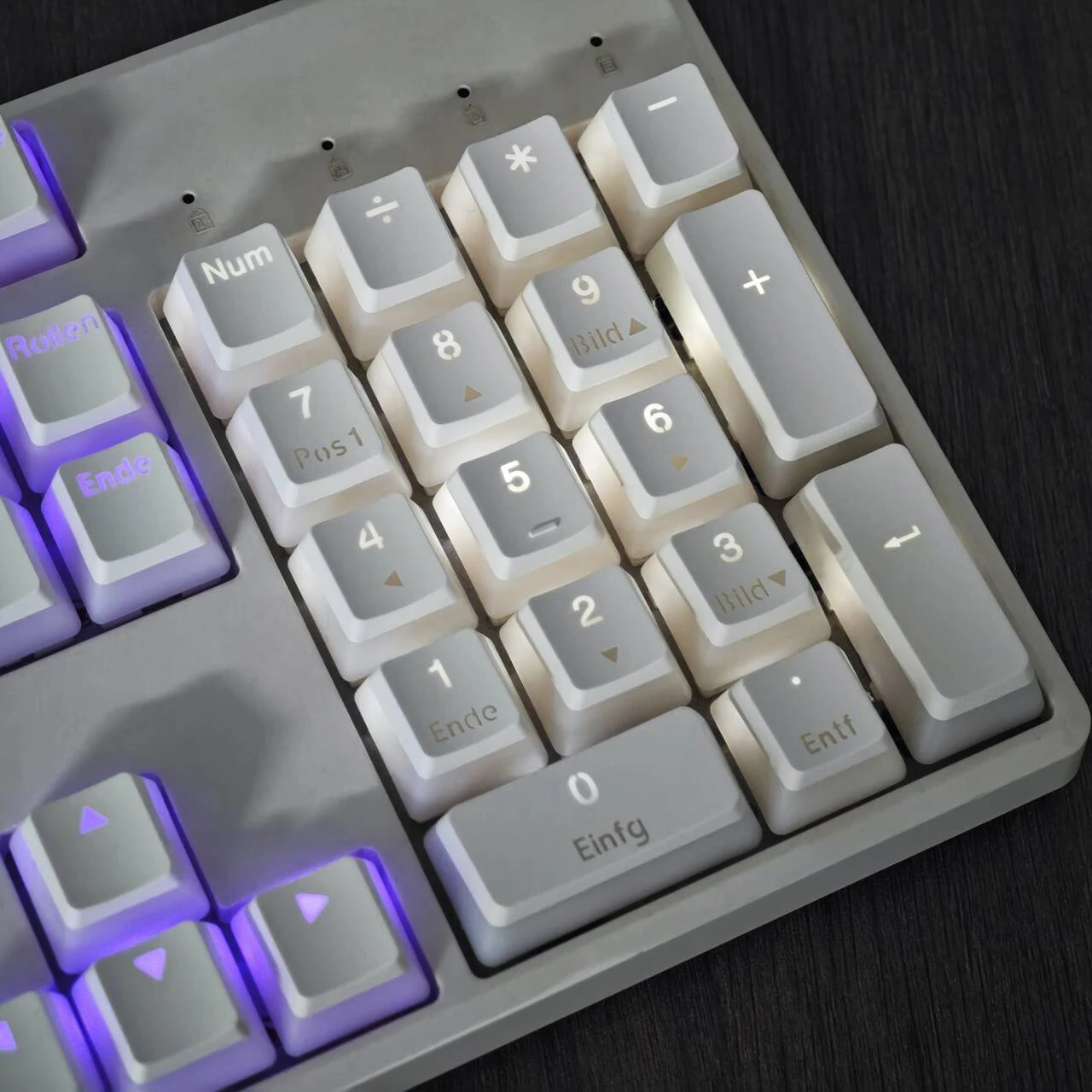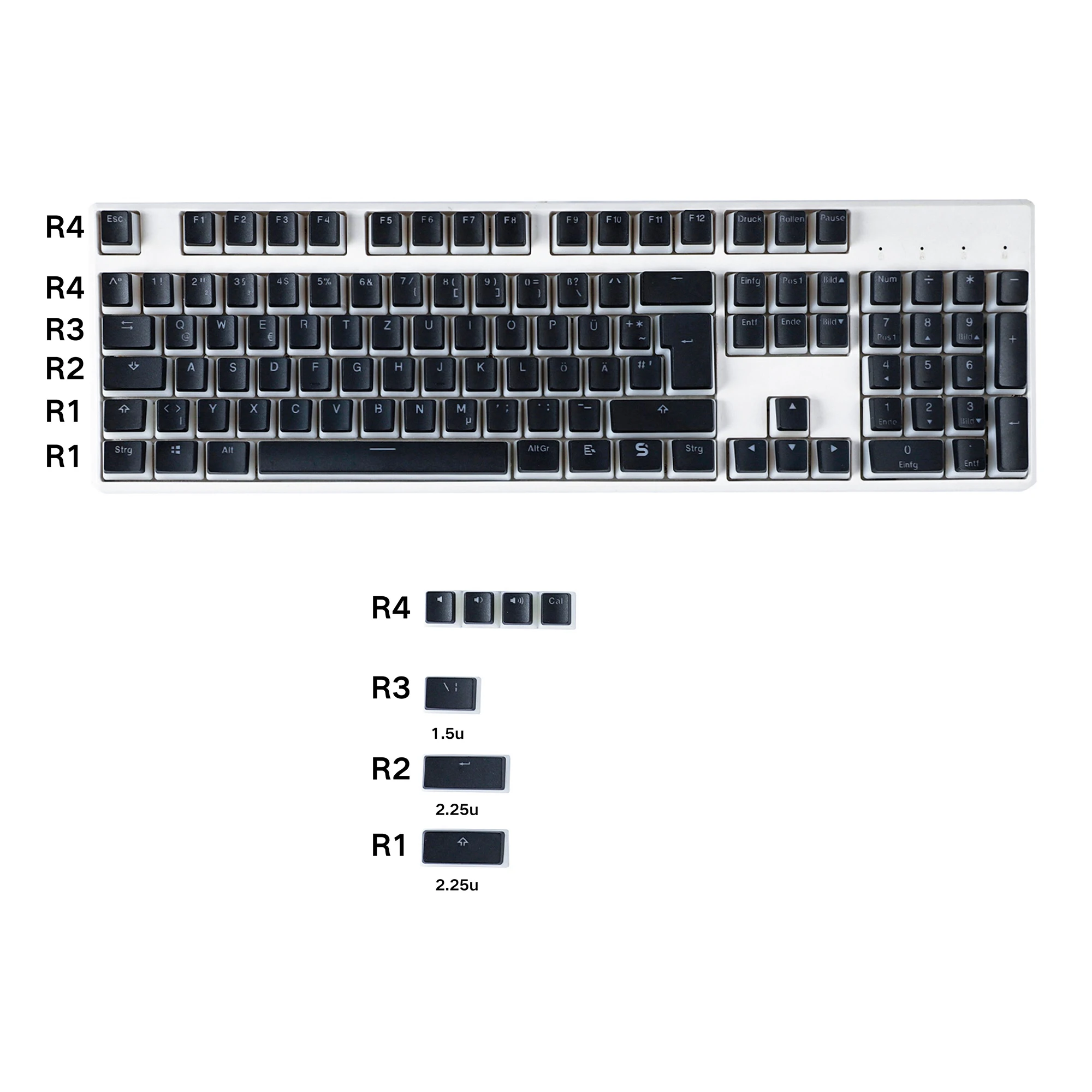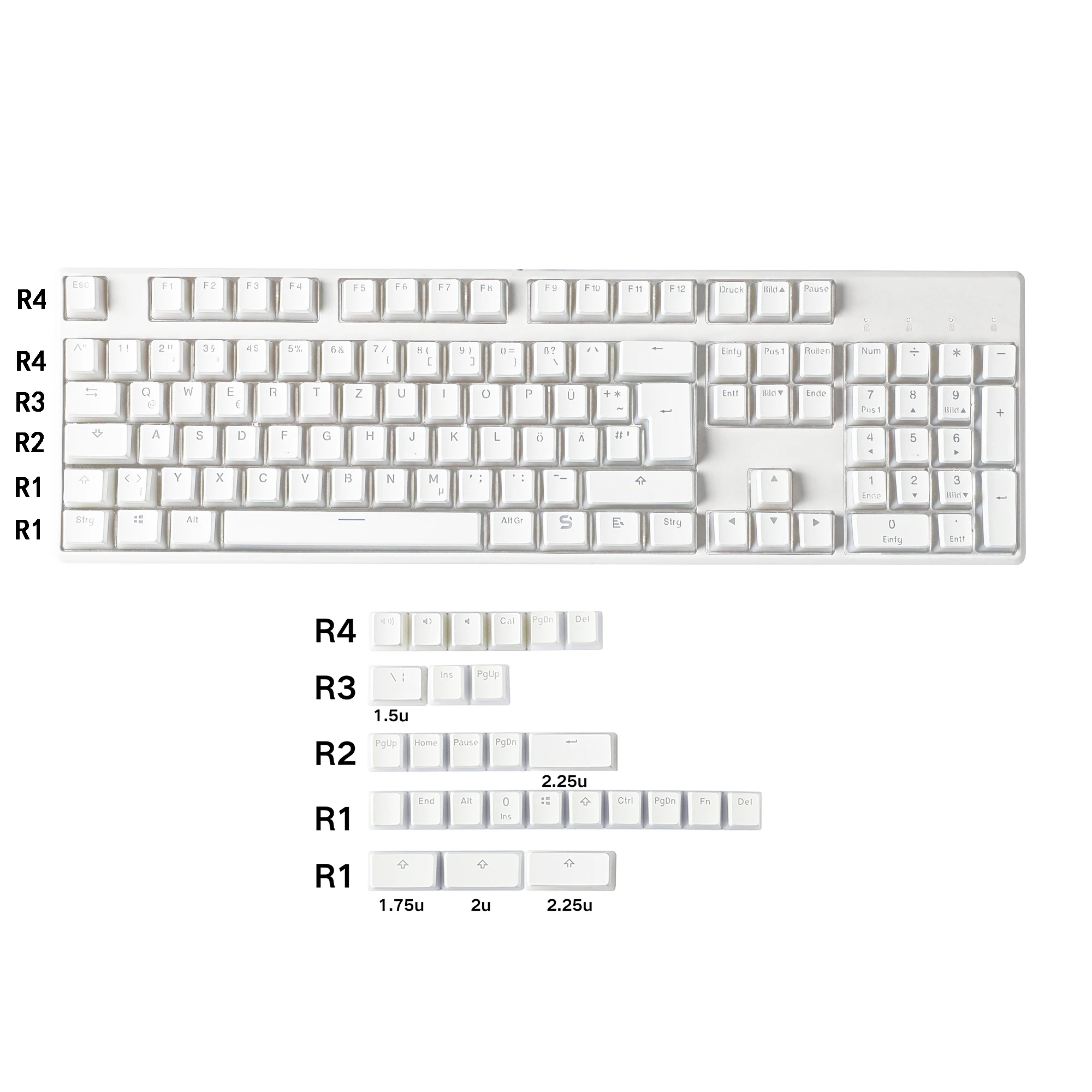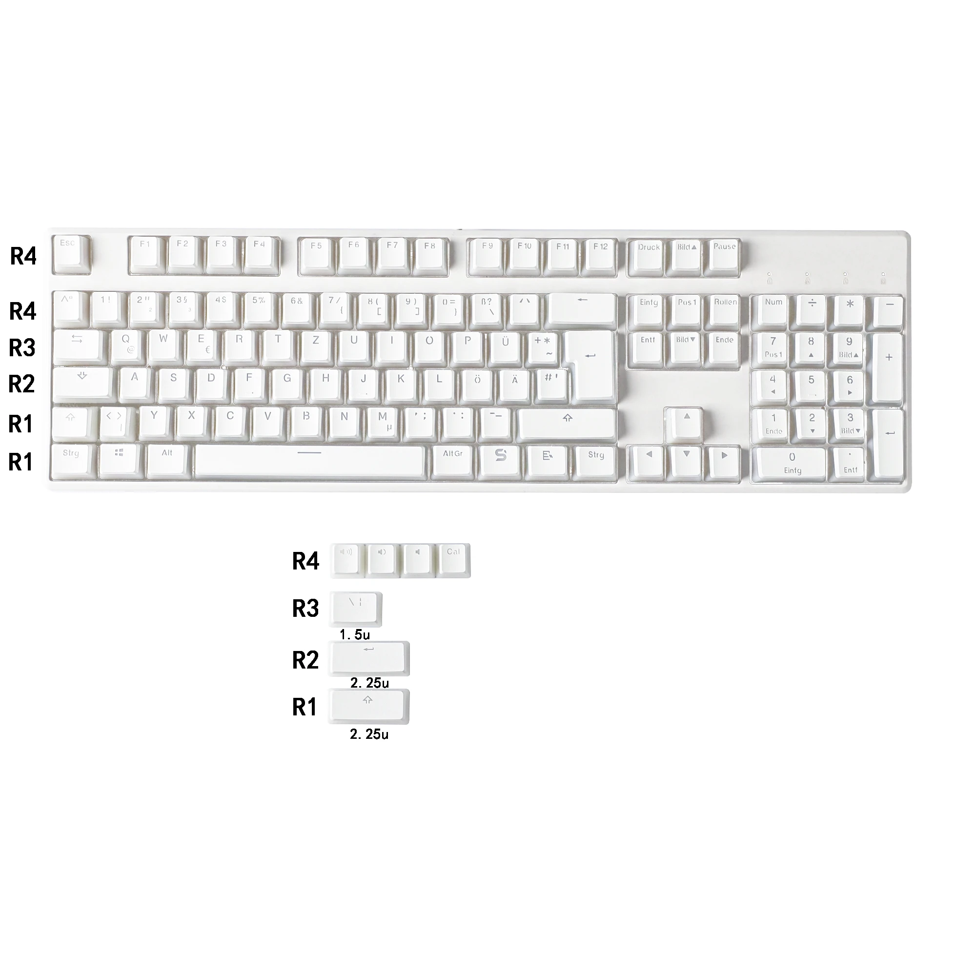 Incluye teclas base alemanas: 105 teclas OEM + 4 teclas novedosas + 1 cambio ANSI + 1 entrada ANSI y \| + Extractor