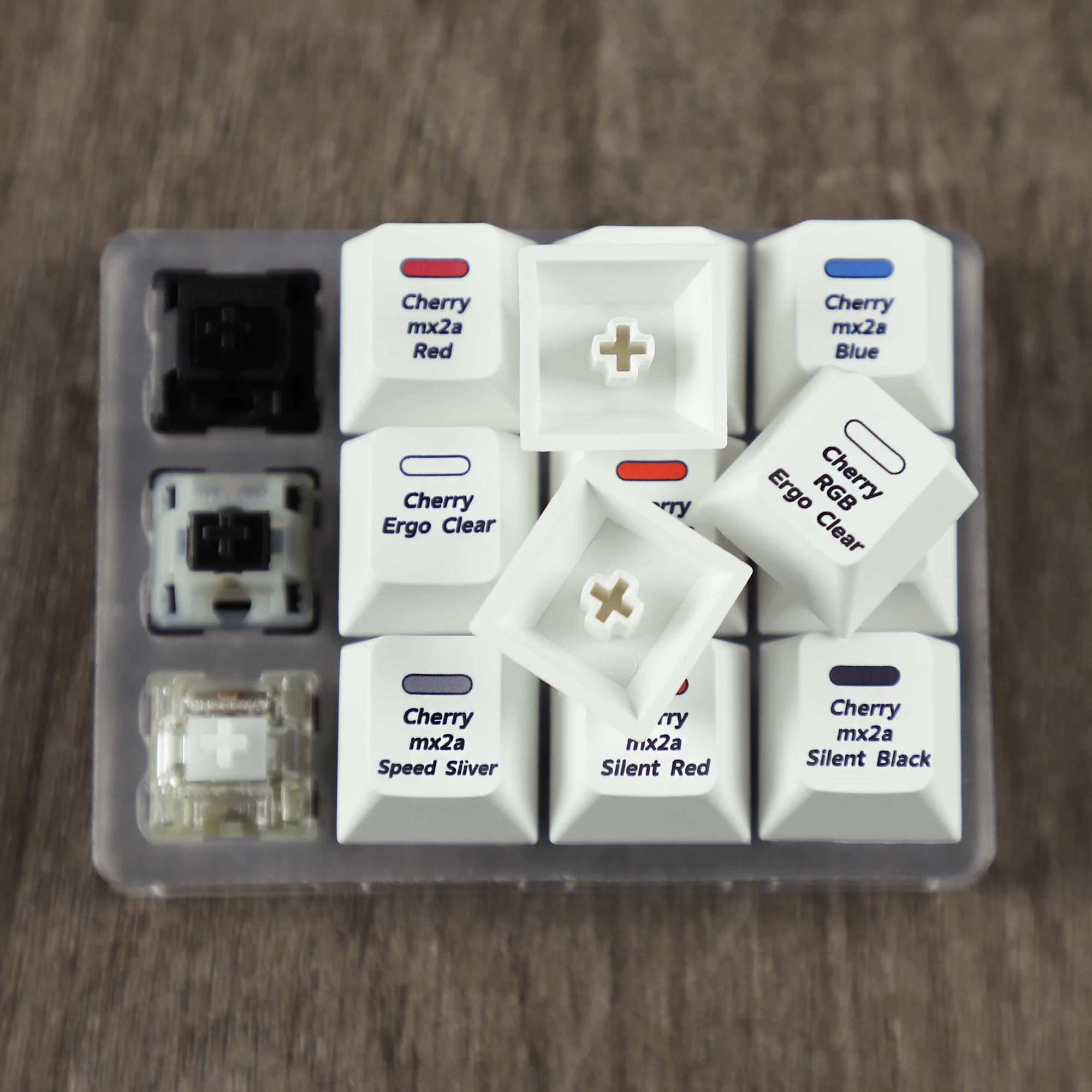 Un probador de interruptores incluye: 12 interruptores de cereza + tablero acrílico + 12 teclas de cereza por sublimación.