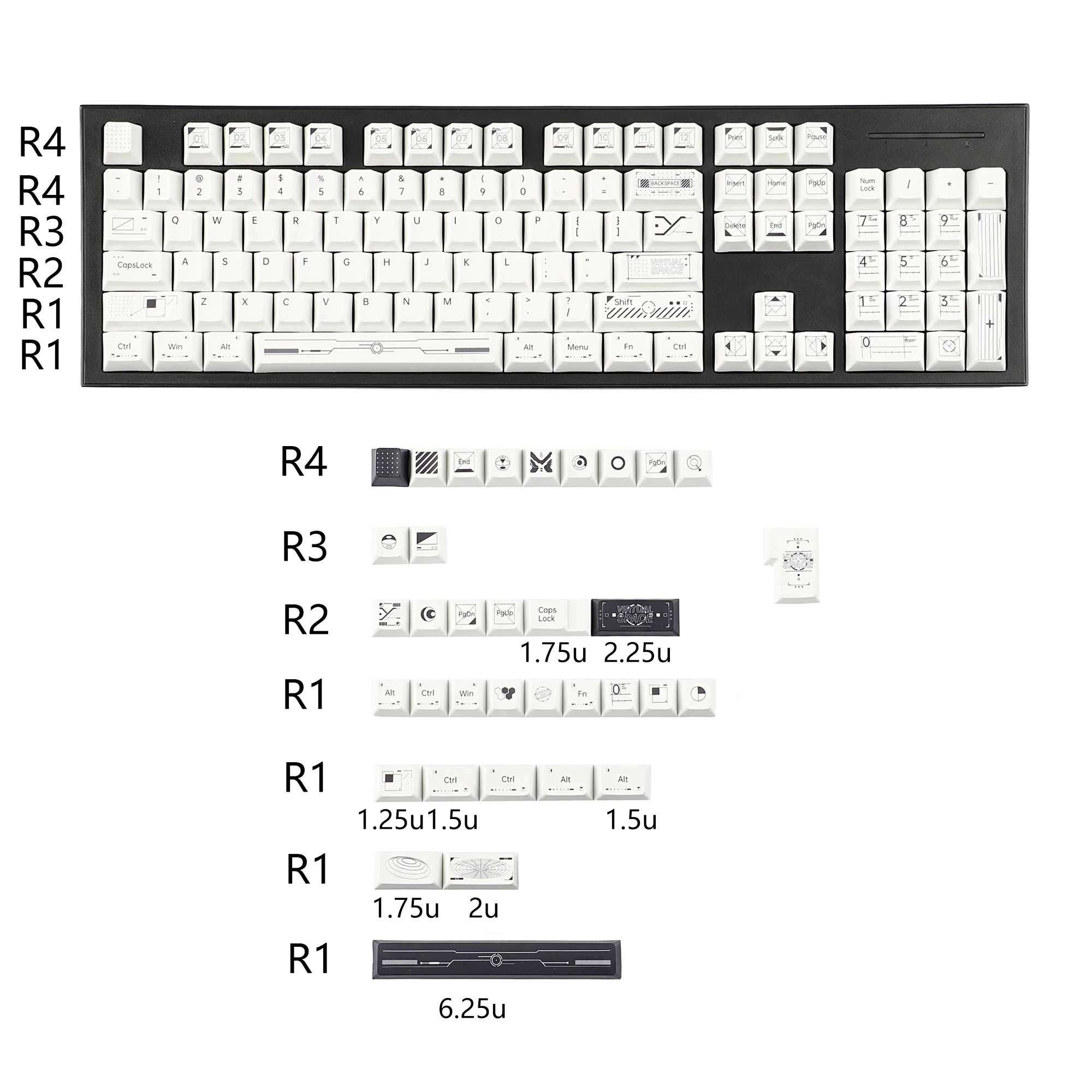 Compatible con la mayoría de los teclados mecánicos Mx con diseño 61/64/67/68/75/87/98/104/108 cuya barra espaciadora es de 6,25 u, alrededor de 4,61 pulgadas.