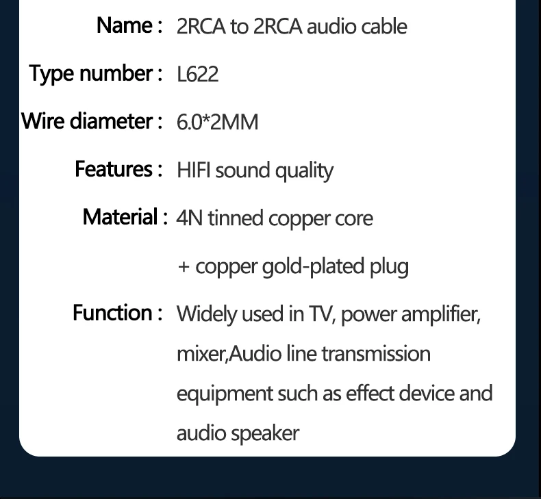Función: Ampliamente utilizado en el transporte de puerto Lotus RCA estándar: reproductor, amplificador de potencia, mezclador, dispositivo de efectos, ecualizador, audio, tarjeta de sonido y otros equipos para transmitir señales de audio.