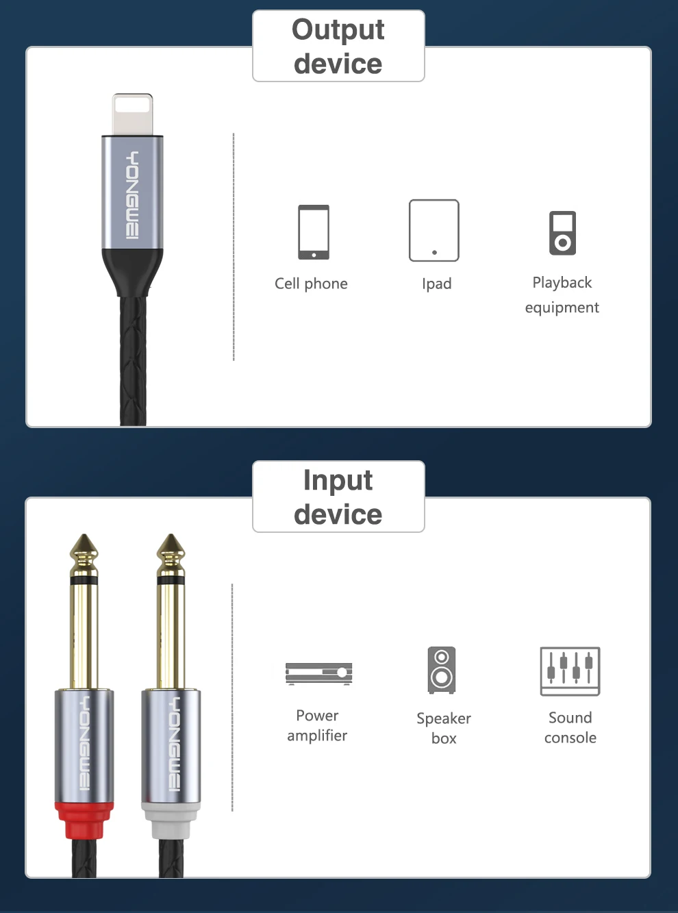 Trabajo y energía: Interfaz Lightning, teléfono móvil, espera, conexión de amplificador, altavoz, amplificador de potencia, mezclador y otros equipos.