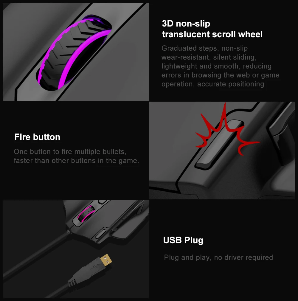 「 Botones de ratón programables 」 Todos los botones de macro le permiten personalizar las funciones a sus necesidades específicas y se pueden asignar fácilmente a cualquiera de las teclas del teclado habituales, combos. MMO ratón de juego con botones laterales se puede asignar a lo que mejor se adapte a su estilo de juego se colocan al alcance de su pulgar. "Botón de disparo automático" es una clave conveniente para la mayoría de los juegos que puede optimizar sus preferencias. Hace que el juego sea mucho más fácil e incluso tiene la capacidad de aumentar su nivel de juego.
