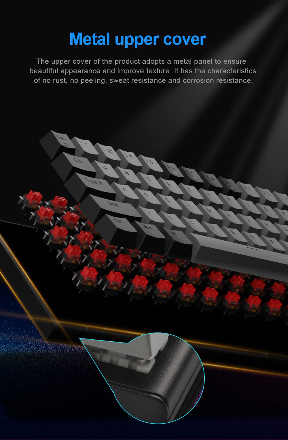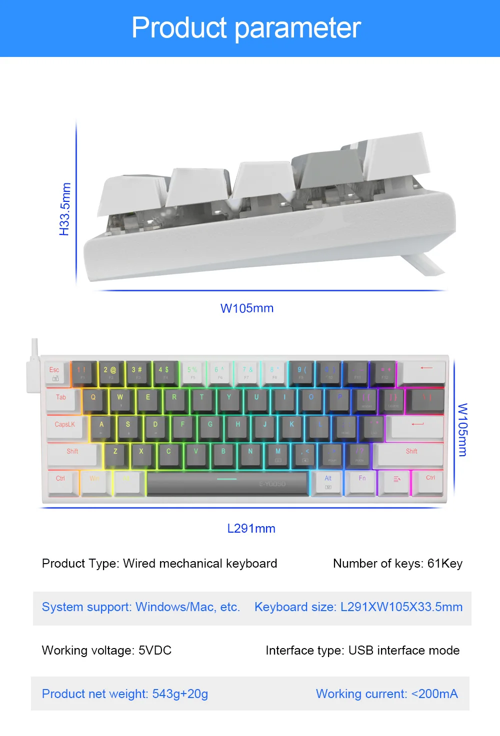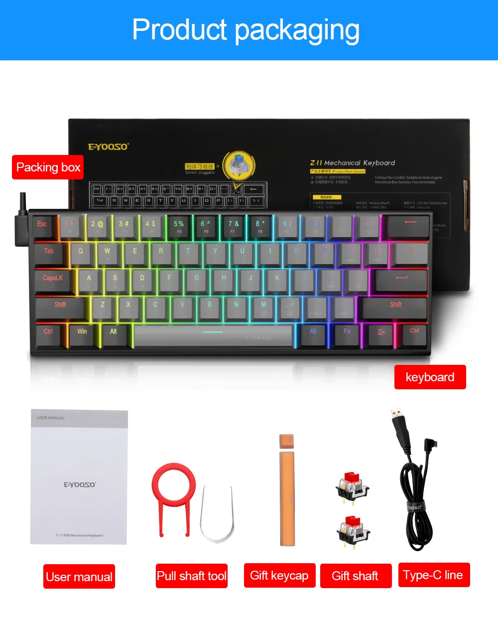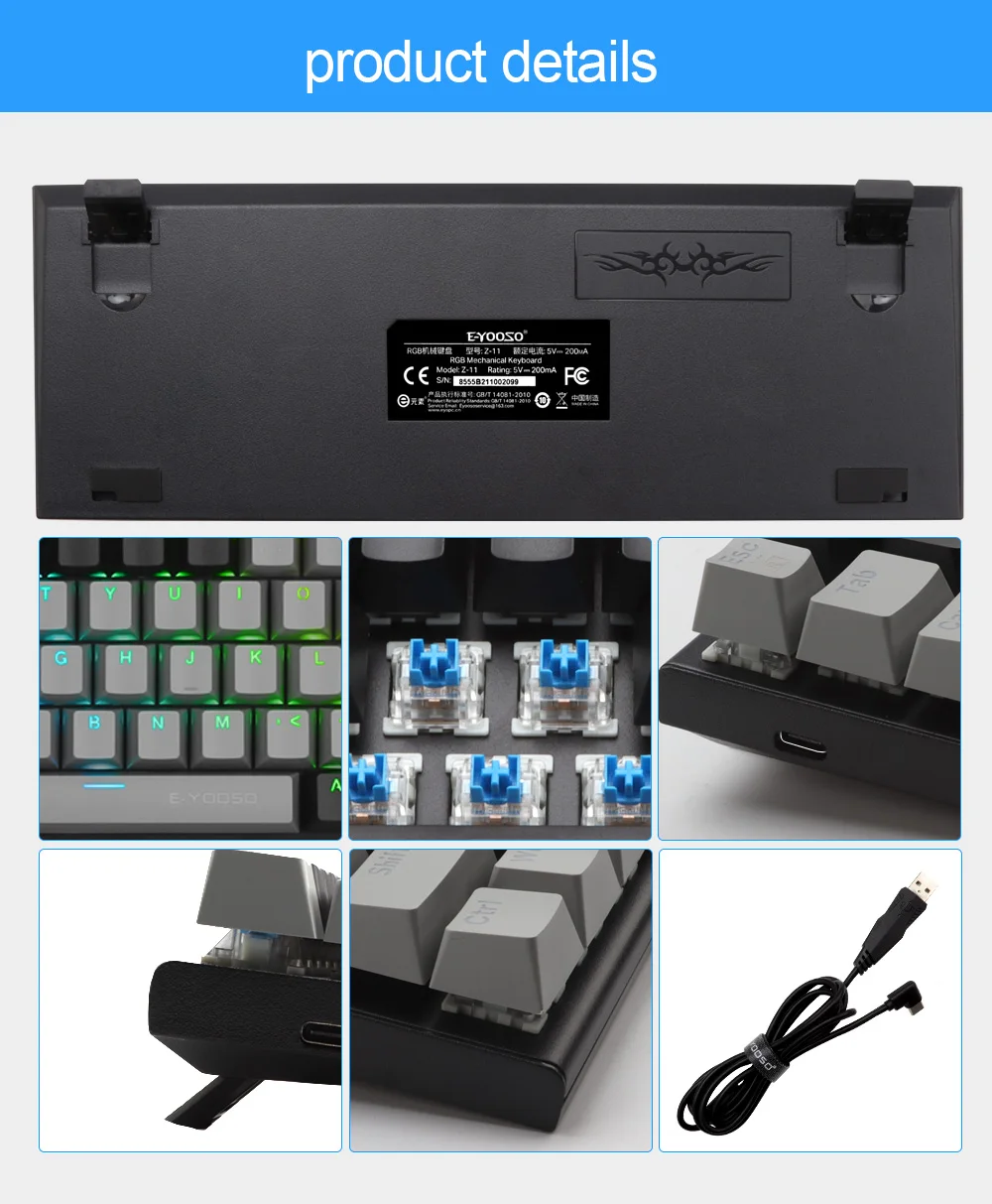 [Excelente interruptor azul]: el teclado mecánico E-YOOSO utiliza interruptores azules, vida útil de 50 millones de pulsaciones de teclas, 2.Distancia de 2 mm a la actuación, fuerza de accionamiento de 50 g, el interruptor azul ofrece una respuesta más rápida y elástica, cada vez que presiona cualquier tecla, puede obtener claramente la respuesta del clic y con un sonido claro de "kacakaca", perfecto para jugar y escribir.