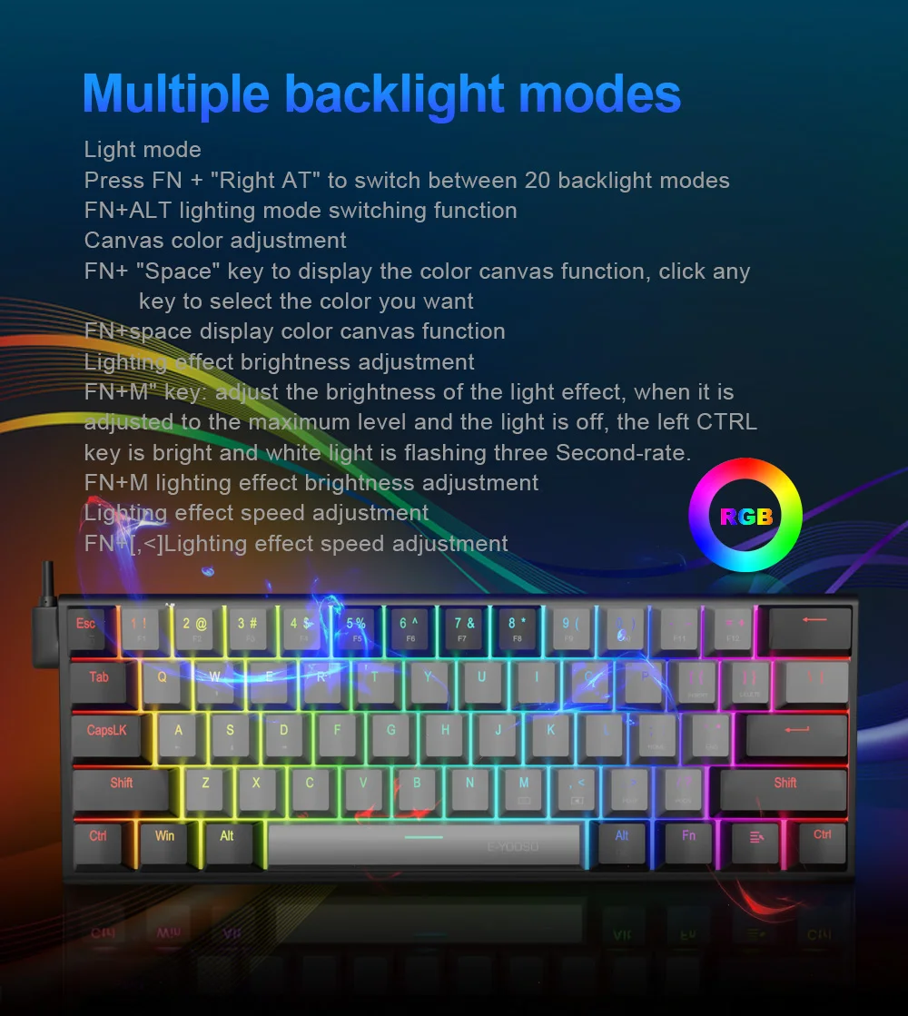 [Teclado RGB vibrante]: el teclado mecánico para juegos E-YOOSO tiene 20 modos de retroiluminación RGB.Puede cambiar diferentes modos de iluminación con "FN2+Alt", puede ajustar el brillo de la luz con "FN+M" y también puede ajustar la velocidad de la luz con "FN+ ".Además, también puedes personalizar el color de iluminación de cada tecla a través del software de teclado Z-11RGB.Las teclas moldeadas por inyección de doble disparo proporcionan una retroiluminación uniforme, elegante y clara sin reflejos.