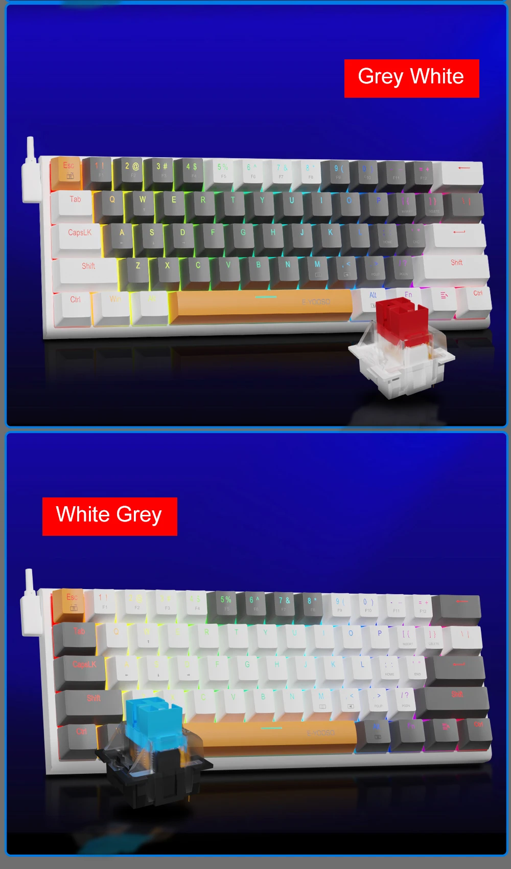 [Teclado mecánico ergonómico]: el teclado E-YOOSO 60 por ciento es un teclado mecánico con el diseño científico de teclas para escaleras que brinda la máxima comodidad, manteniendo su mano en un estado más natural para minimizar la fatiga de la mano después de un uso prolongado y ayudarlo a minimizar los puntos de fraguado.Por lo tanto, está diseñado para jugadores, oficinistas, copywriter, programadores, profesores de escritura y editores.