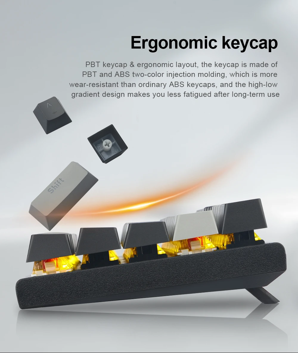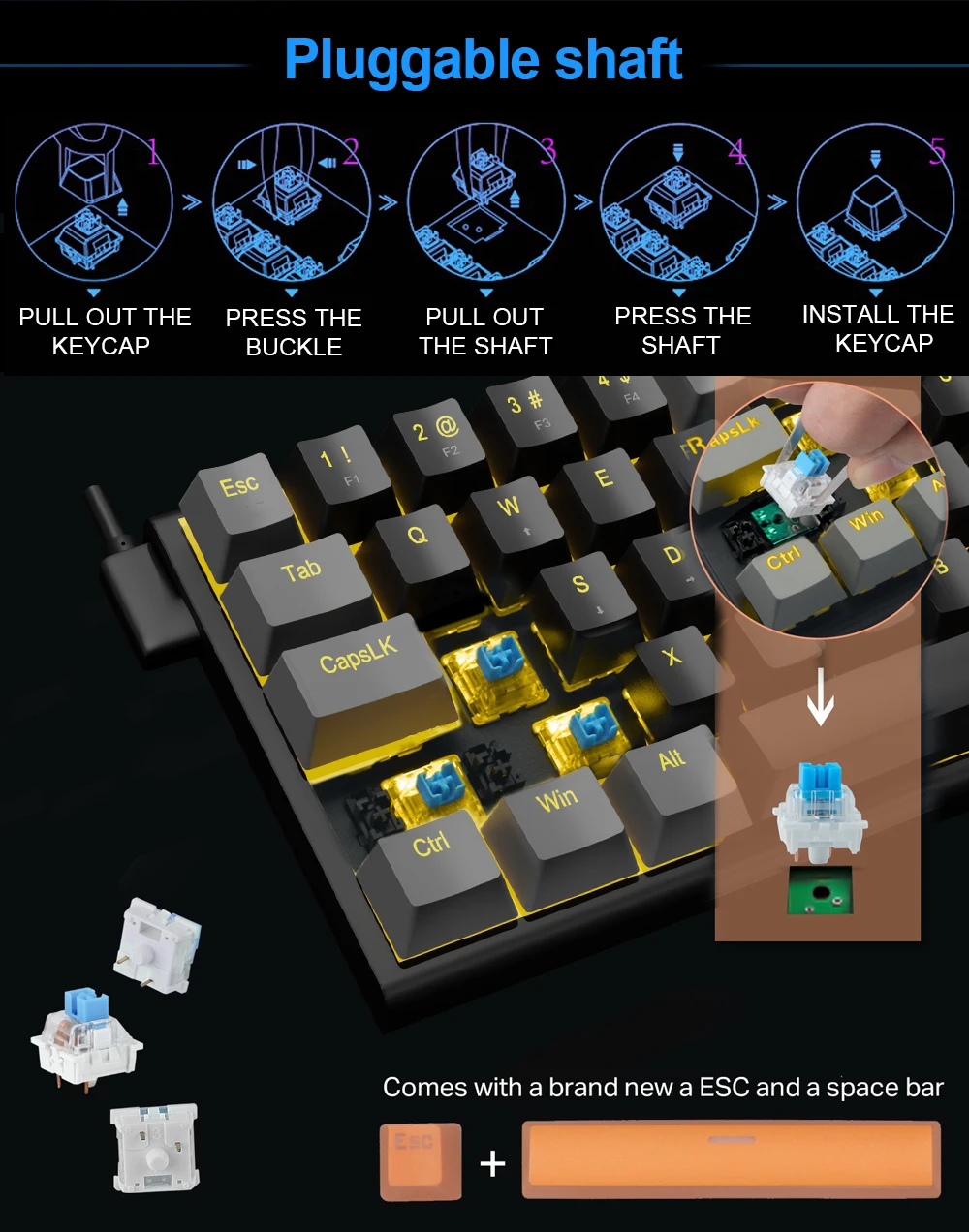 Tecla de doble inyección intercambiable en caliente: la PCB de intercambio en caliente le permite reemplazar los interruptores de 3 pines libremente sin problemas de soldadura, puede disfrutar de la diversión de hacer diferentes interruptores en un teclado, creando su propio teclado único.La tecla de doble inyección proporciona una retroiluminación uniforme y cristalina y nunca se desvanece.(Viene con dos teclas adicionales gratis: ESC y barra espacial)