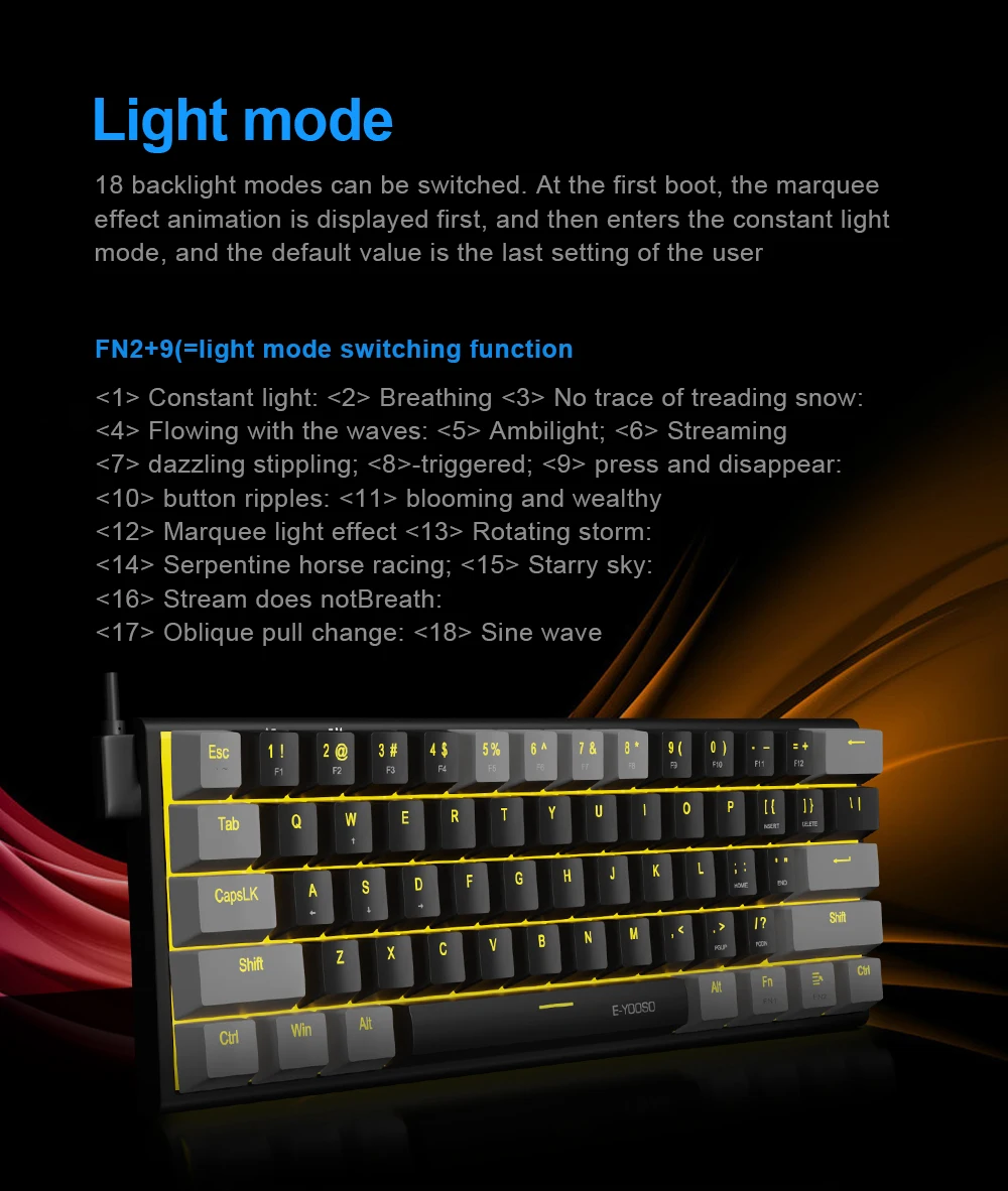 【18 modos de retroiluminación】: el teclado mecánico para juegos E-YOOSO tiene 18 modos de retroiluminación.Puedes cambiar diferentes modos de iluminación con "FN2+9", también puedes ajustar el brillo de la luz con "FN2 + -/+".Además, también puedes ingresar al modo de configuración de iluminación personalizada mediante "FN2+ ←".Si no necesita retroiluminación, puede desactivar "FN2+0".Las teclas moldeadas por inyección de doble disparo proporcionan una retroiluminación uniforme, elegante y clara sin reflejos.