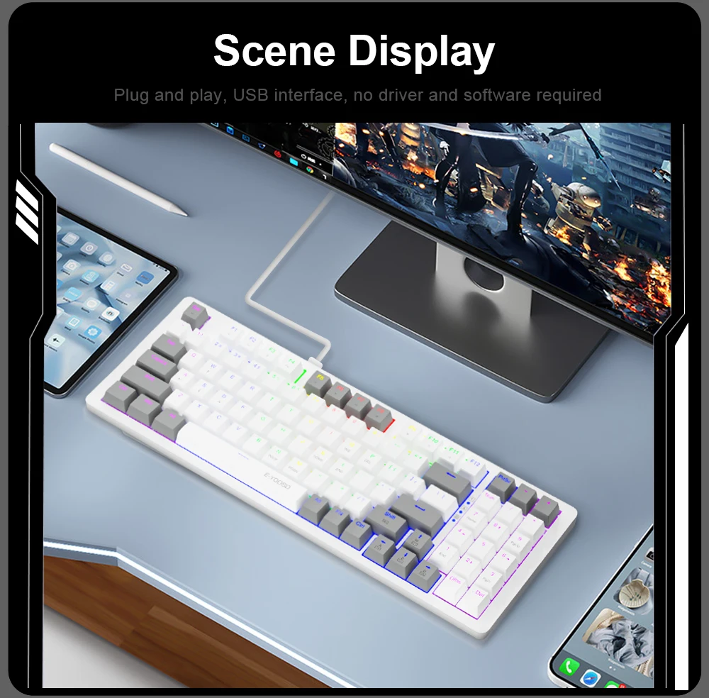 Práctico Wired 94 Keys - E-YOOSO 85% diseño Z94 en modo de cable satisface la necesidad del usuario de teclas de flecha separadas y las teclas numéricas. El diseño de 94 teclas proporciona el equilibrio final de compacidad y funcionalidad de 104 teclas, lo que permite la curva de hábito más suave.