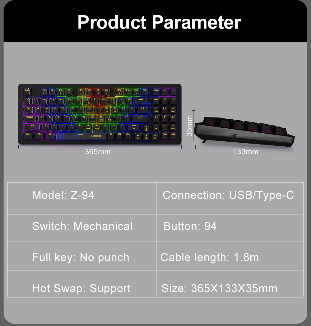 Diseño compacto con 94 teclas: E-YOOSO Teclado mecánico Z-94 mantiene el teclado numérico y las teclas de flecha, será mucho más conveniente para su trabajo y juegos.