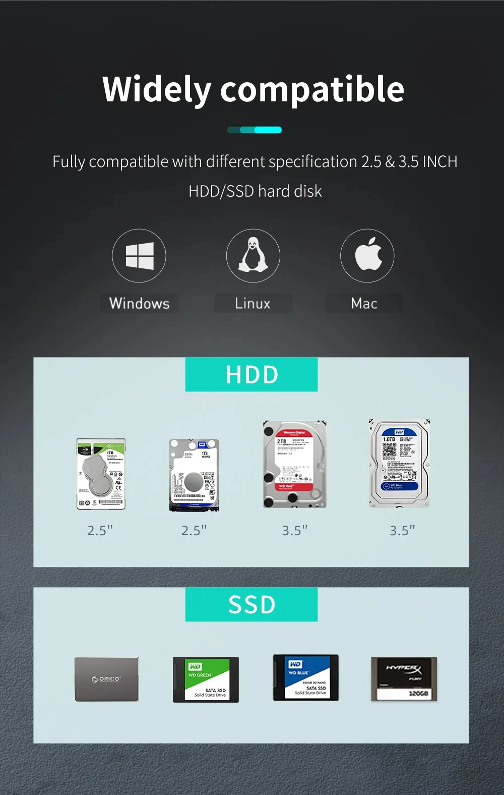 Totalmente compatible con diferentes especificaciones Disco duro HDD/SSD de 2,5 "y 3,5" PULGADAS