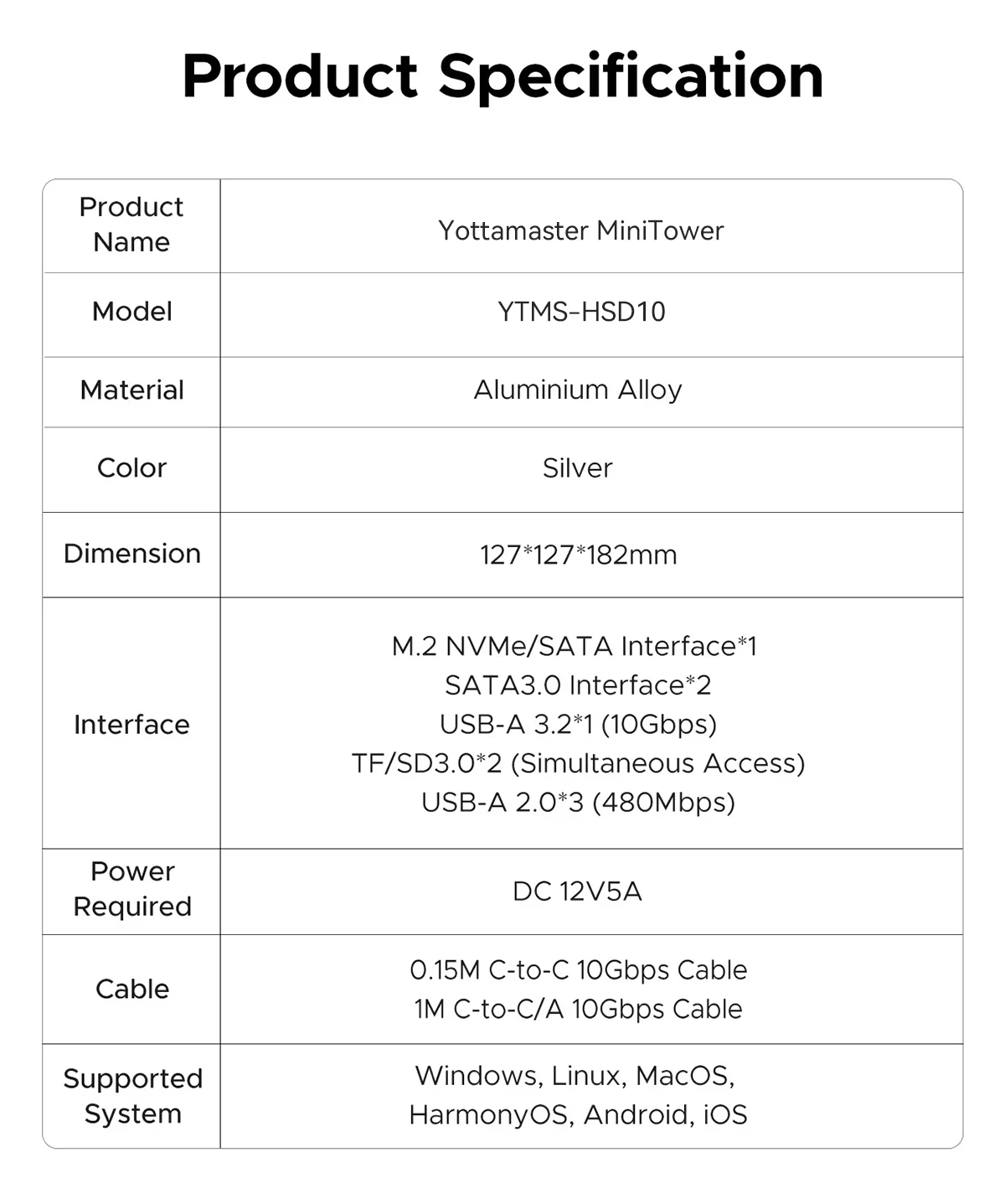 Maximice el potencial de su Mac Mini con el Yottamaster Mini Tower Dock, la solución de almacenamiento todo en uno diseñada para brindar rendimiento, versatilidad e integración perfecta.Diseñada para complementar el elegante factor de forma de su Mac, esta potente estación de acoplamiento transforma su escritorio en una potencia de datos centralizada.