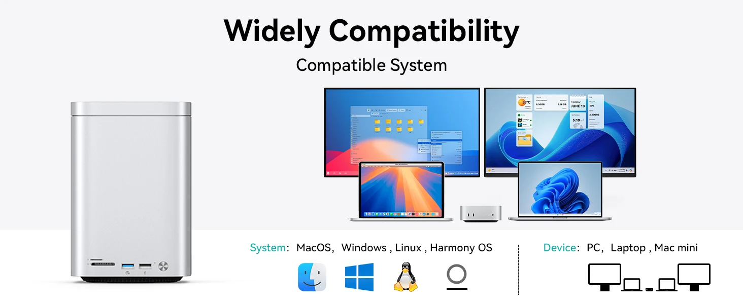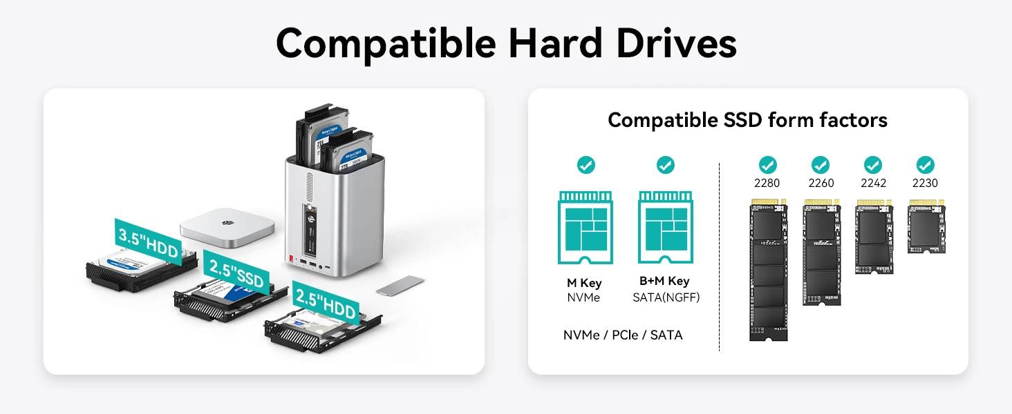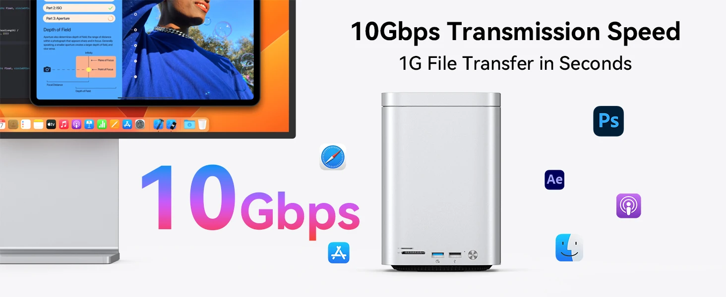 Equipada con una interfaz USB 3.2 Gen 2, la base ofrece velocidades teóricas de hasta 10 Gbps.Disfrute de un acceso rápido a archivos, copias de seguridad rápidas y una edición fluida de video 4K directamente desde sus unidades externas, lo que reduce drásticamente los tiempos de espera y aumenta la productividad.