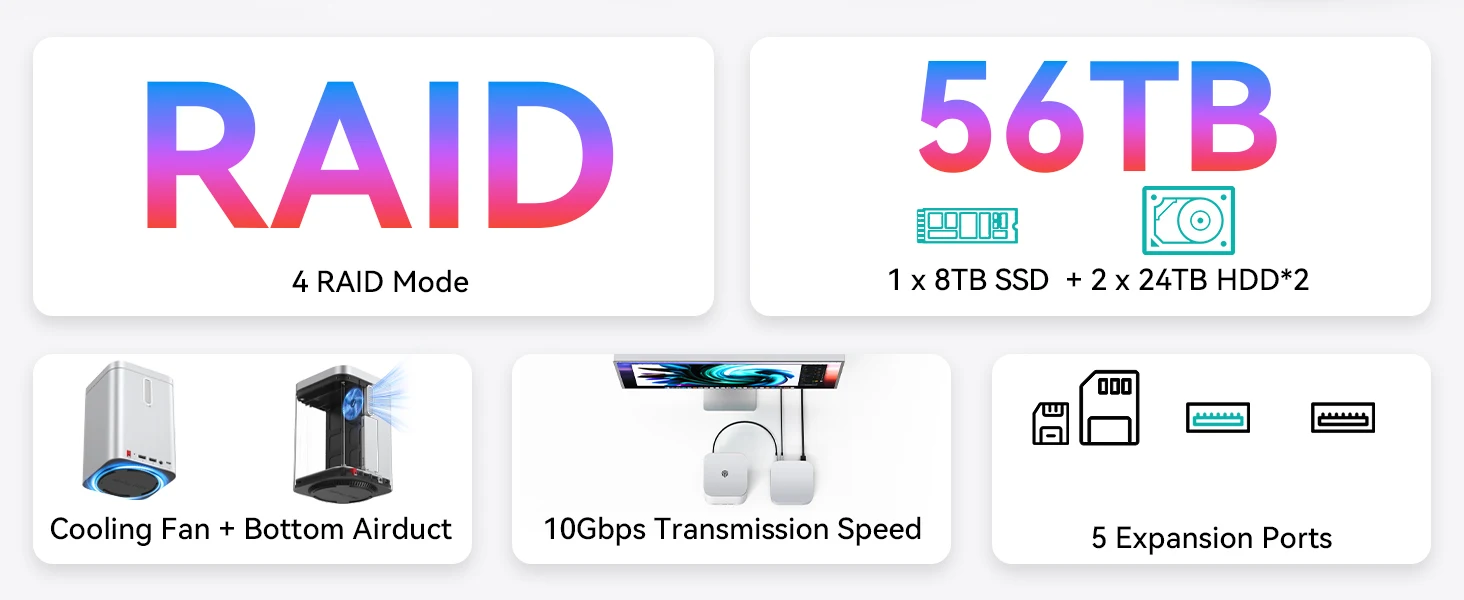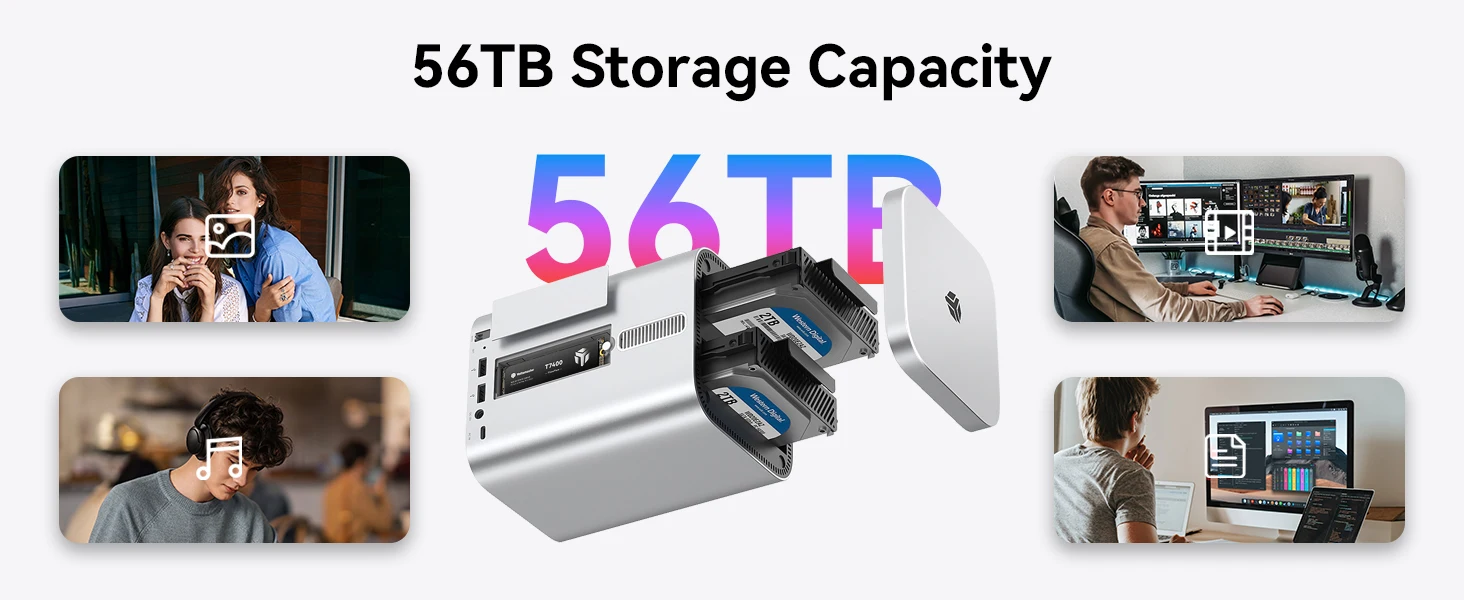 La mayor expansión de bricolaje compatible: 56 TB máx. (SSD de 8 TB + HDDX2 de 24 TB)
