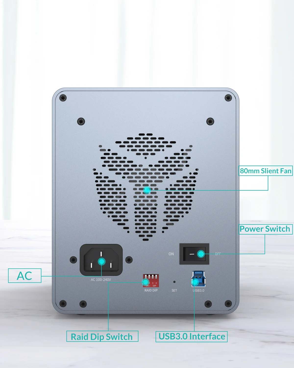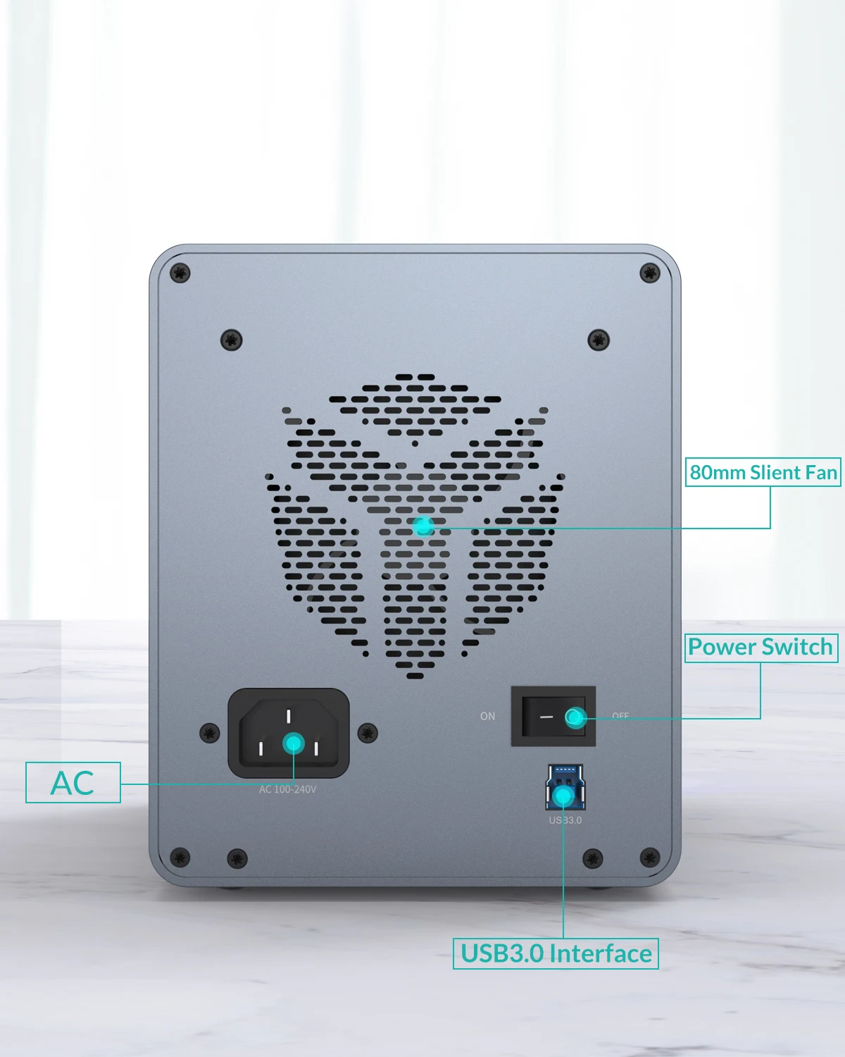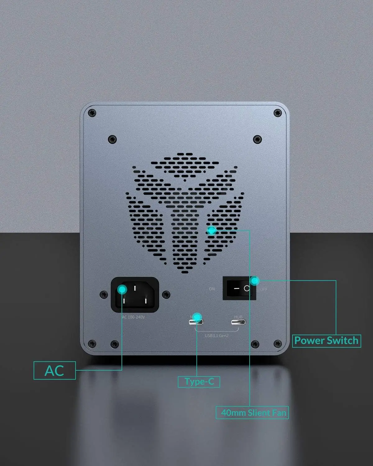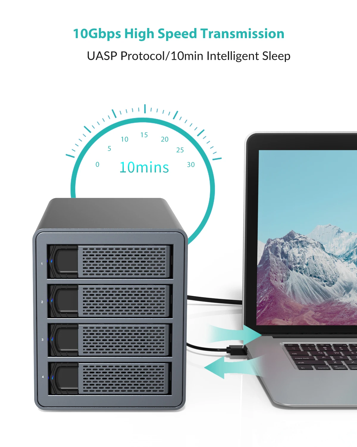 Esta carcasa de disco duro de 4 compartimentos utiliza el protocolo USB 3,1 Gen 2 (tipo C) para ofrecer velocidades de transferencia de hasta 10Gbps (máximo).