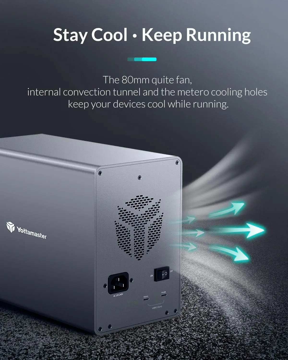 La carcasa del disco duro Yottamaster está hecha de aluminio. No solo estabiliza la estructura mientras está en funcionamiento, sino que también se puede utilizar durante mucho tiempo. Además de un ventilador silencioso de 80mm, orificios de enfriamiento Meteor en los paneles delantero y trasero y una carcasa de aluminio ultrafría para mantener la conducción fresca durante recorridos largos.