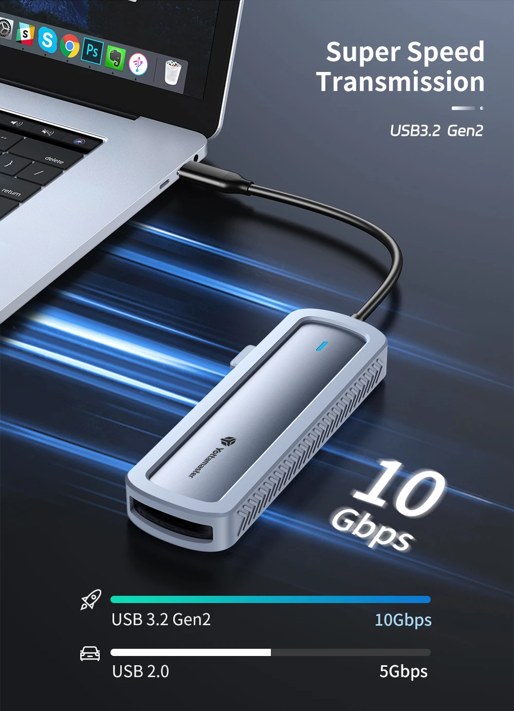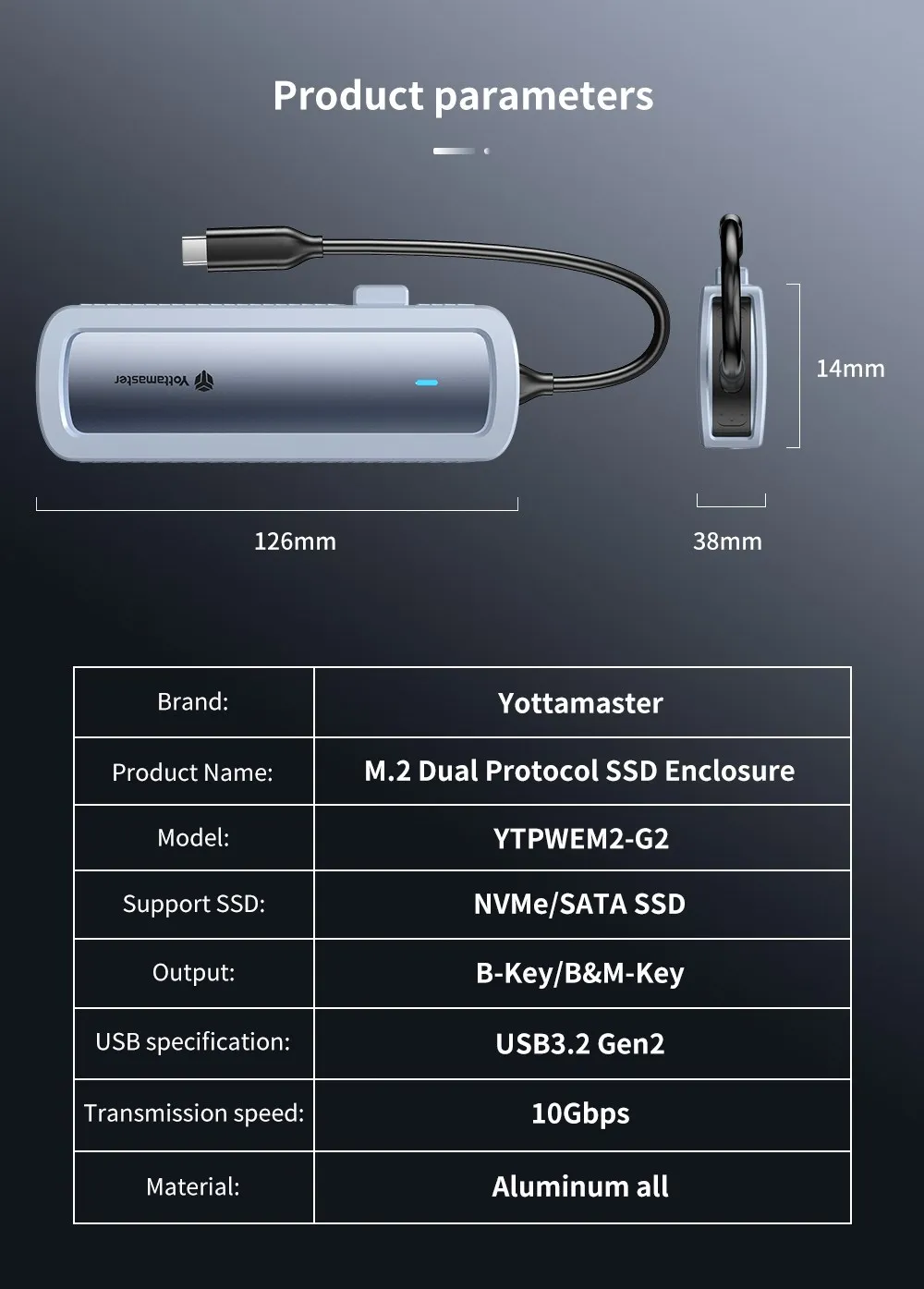 Con el último USB 3.2 Gen2, este gabinete M.2 puede alcanzar una velocidad de transmisión de datos de 10 Gbps como gabinete NVMe y 5 Gbps con protocolos SATA