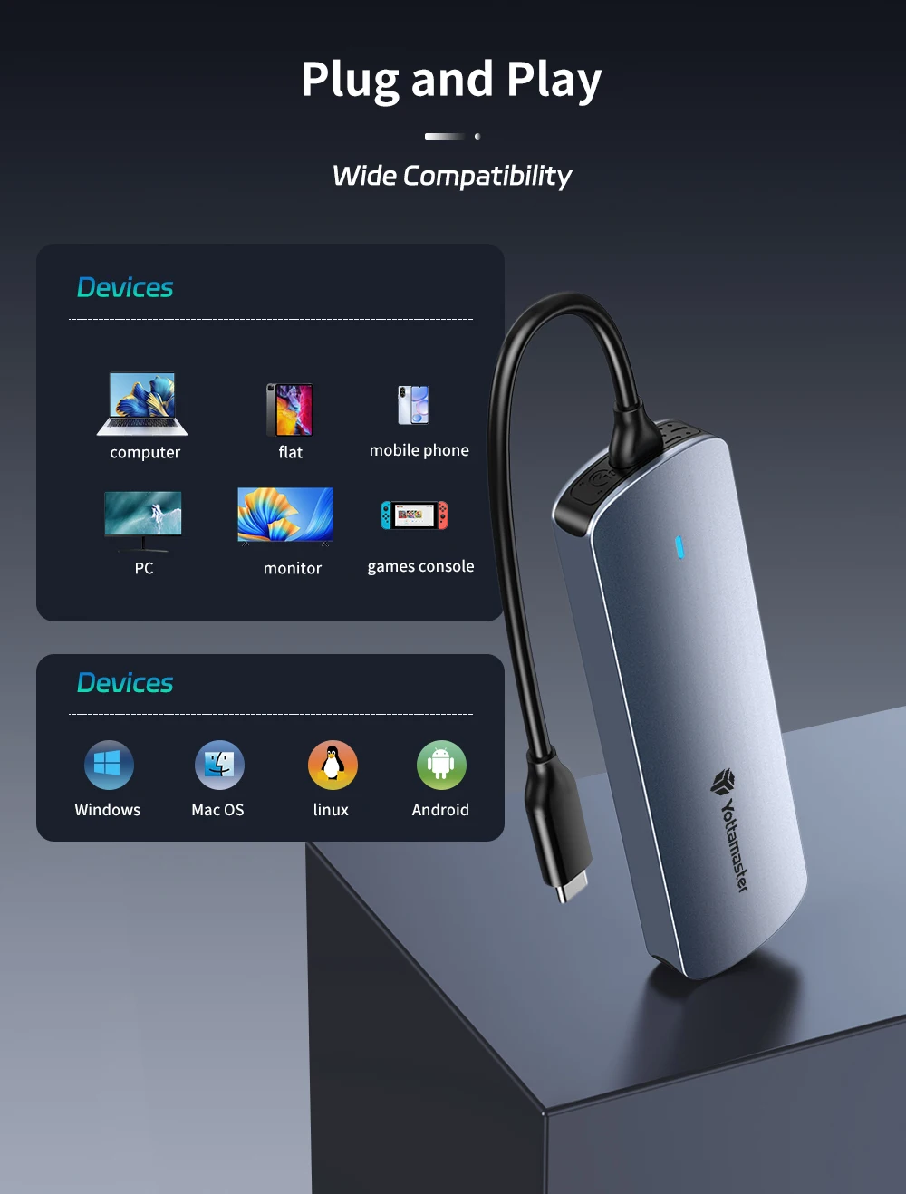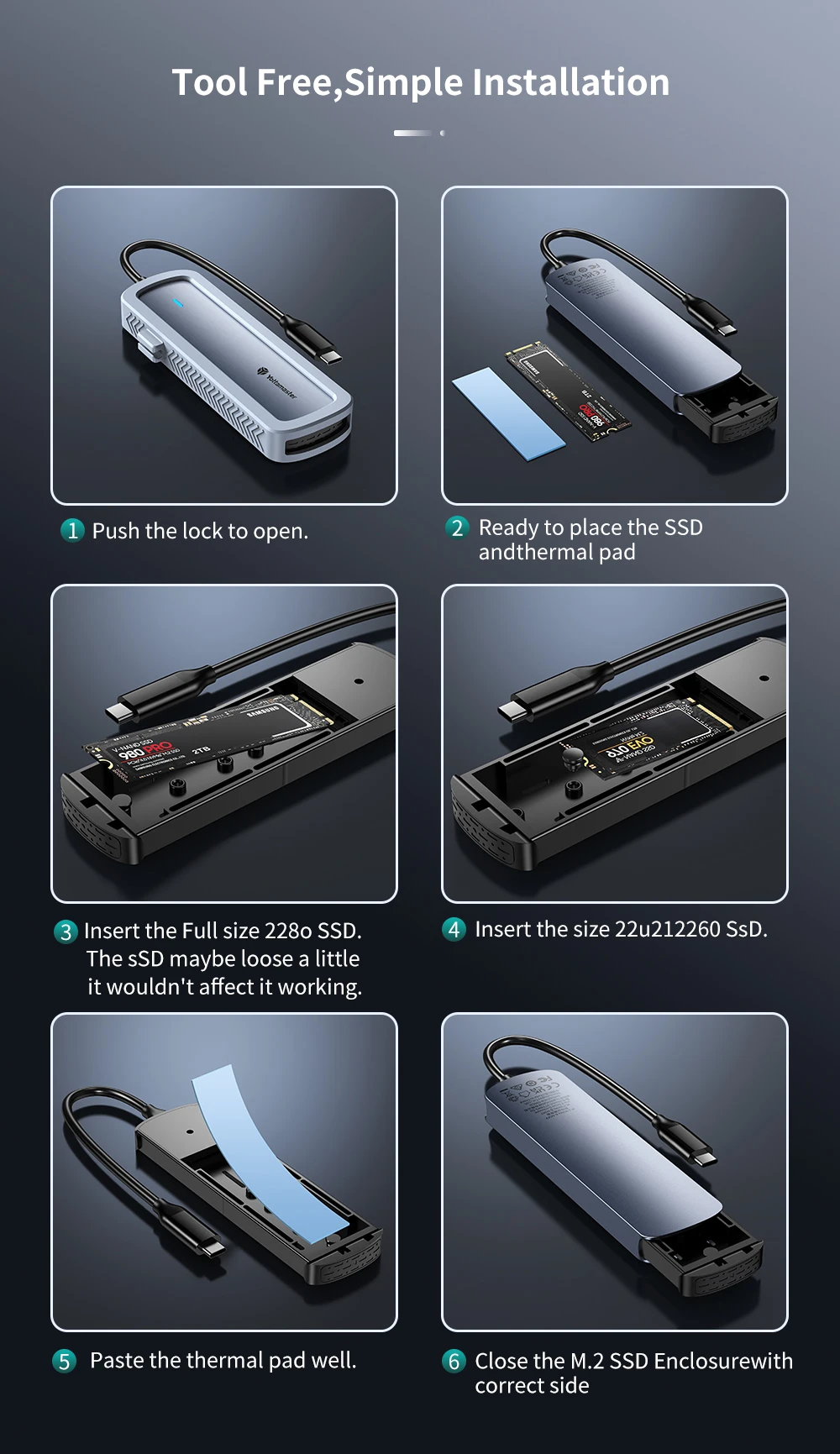 Compatible con Windows/Mac OS/Linux/Android/iOS, Plug and play, no necesita controlador.Simplemente use los sujetadores de goma incluidos para asegurar sus unidades SSD M.2 en la placa.