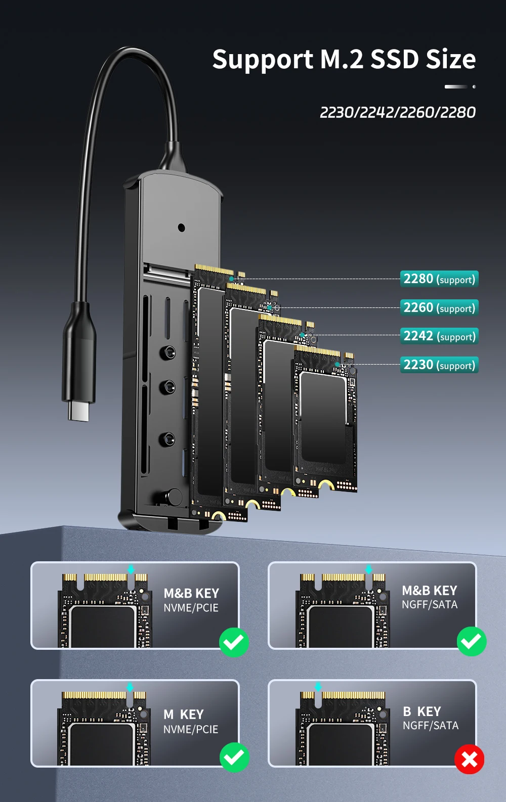 Adecuado para tamaños de 2230/2242/2260/2280 como M.2 NVMe M Key, B&M Key SSD.