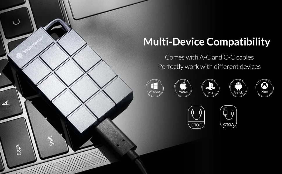 La unidad externa viene con cables USB tipo C A C y USB tipo C A. Se conecta sin problemas a Windows PC, Mac, iPad Pro, Xbox, PS4, teléfonos inteligentes Android y tabletas con puerto USB C.