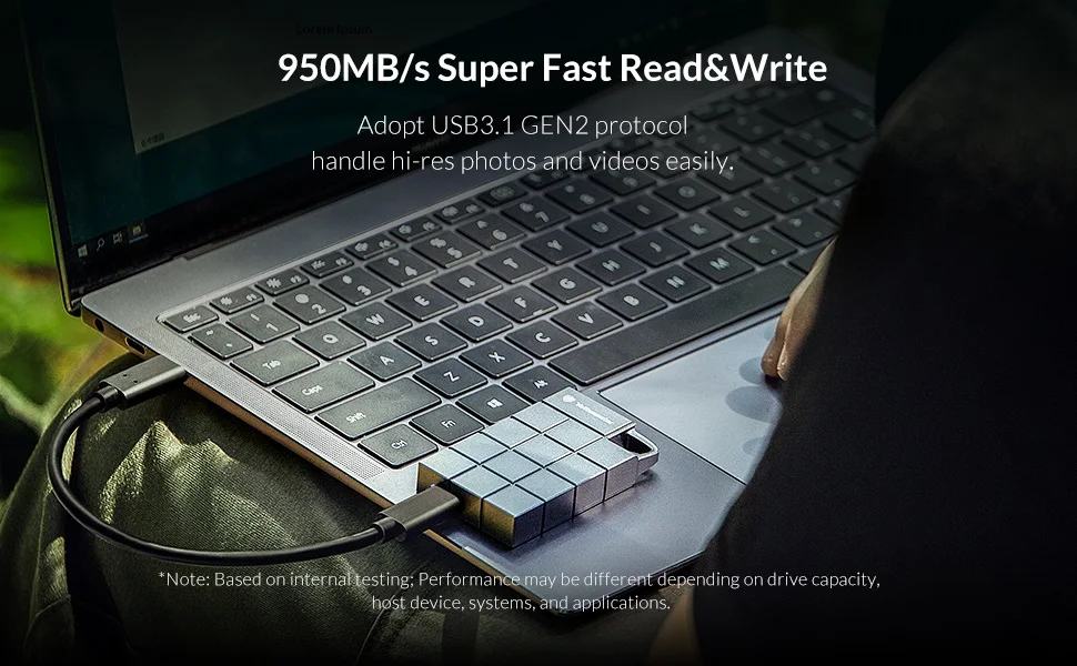 Adopta el protocolo USB3.1 Gen2 10Gbps, velocidades de lectura de hasta 950 MB/s usando C-C cable de datos. 6 veces más rápido que el USB tradicional. Ofrece un rendimiento de alta potencia para flujos de trabajo multistream 4K y VR. Conéctalo al ordenador portátil con un puerto USB3.1 Gen2 para obtener la velocidad máxima. Te permite manejar fotos y vídeos de alta resolución en segundos.