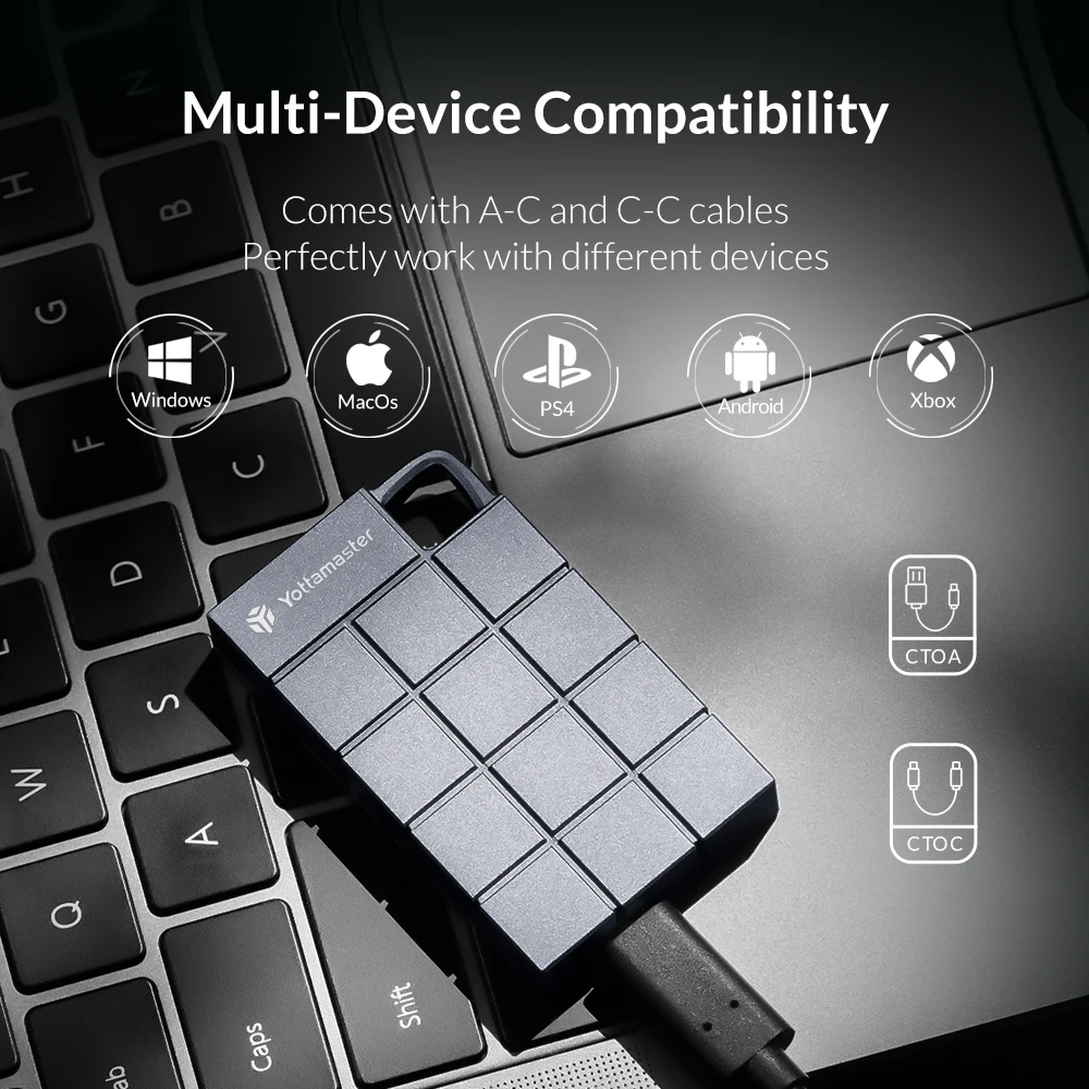 La unidad externa viene con cables USB tipo C A C y USB tipo C A. Se conecta sin problemas a Windows PC, Mac, iPad Pro, Xbox, PS4, teléfonos inteligentes Android y tabletas con puerto USB C.