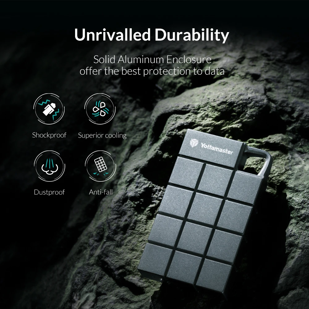 El SSD externo portátil Yottamaster tiene un diseño completamente de aluminio y un gran rendimiento de disipación de calor. Y su estructura unibody de aluminio sólido añade mayor protección, ofreciendo una mejor resistencia a los golpes, a prueba de polvo y anticaída. El diseño de cubo mágico moderno y único destaca la personalización; Los pulverizadores de superficie anodizados lo hacen cómodo de tocar.