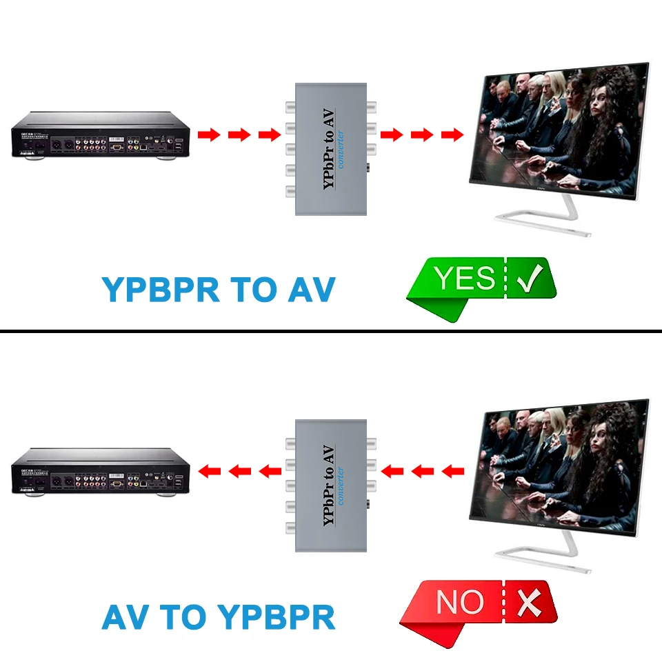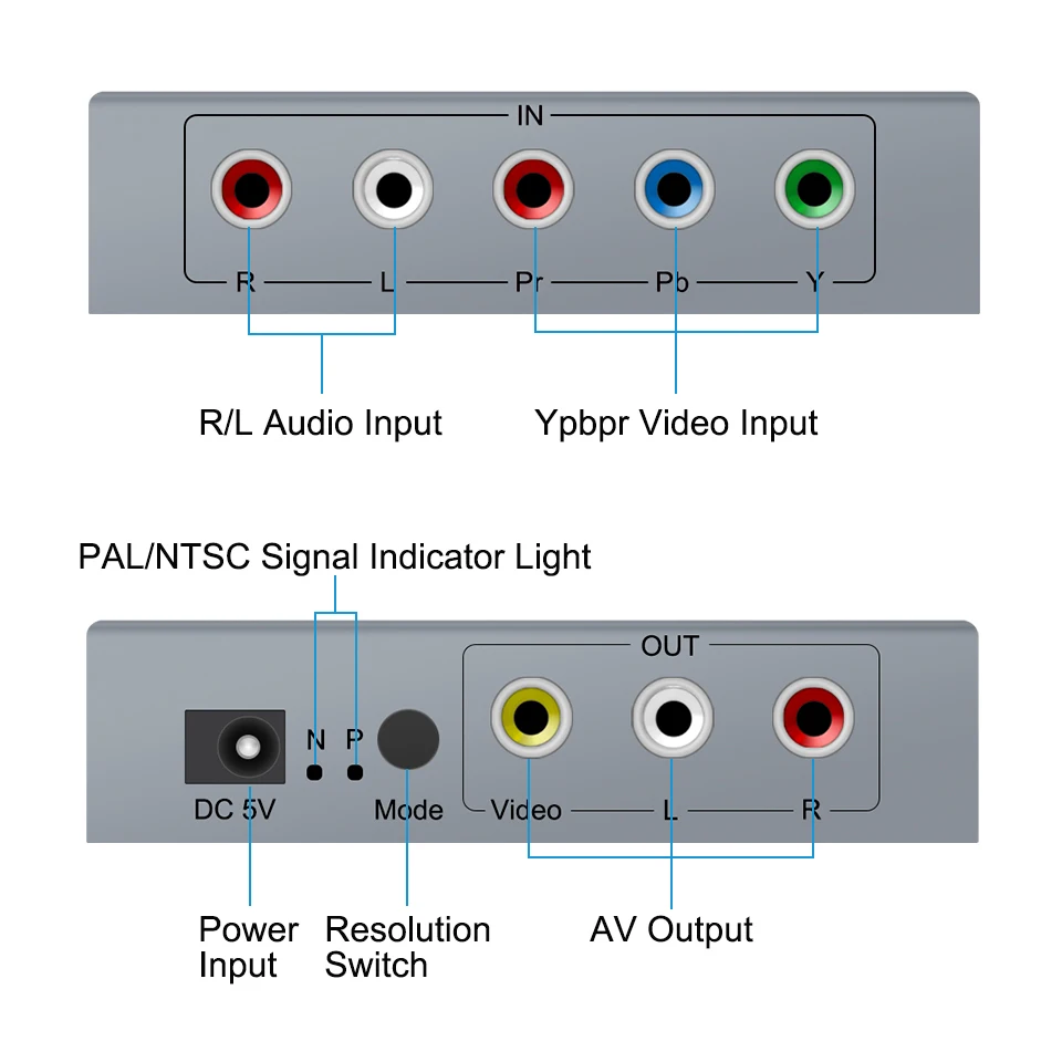 1. Asegúrese de que: la señal es desde el componente YPbPr a AV, y la señal de entrada es el puerto YPbPr (rojo, azul, verde), la señal de salida es el puerto RCA (blanco, rojo, amarillo).